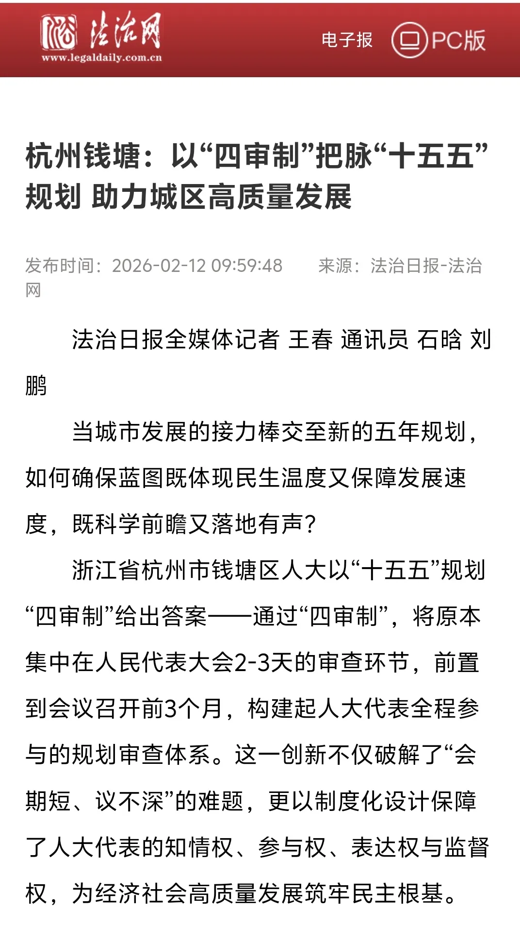近日,法治网刊发《杭州钱塘:以“四审制”把脉“十五五”规划 助力城区高质量发展》一文,聚焦钱塘区人大常委会“十五五”规划“四审制”工作。一起来看看吧▼