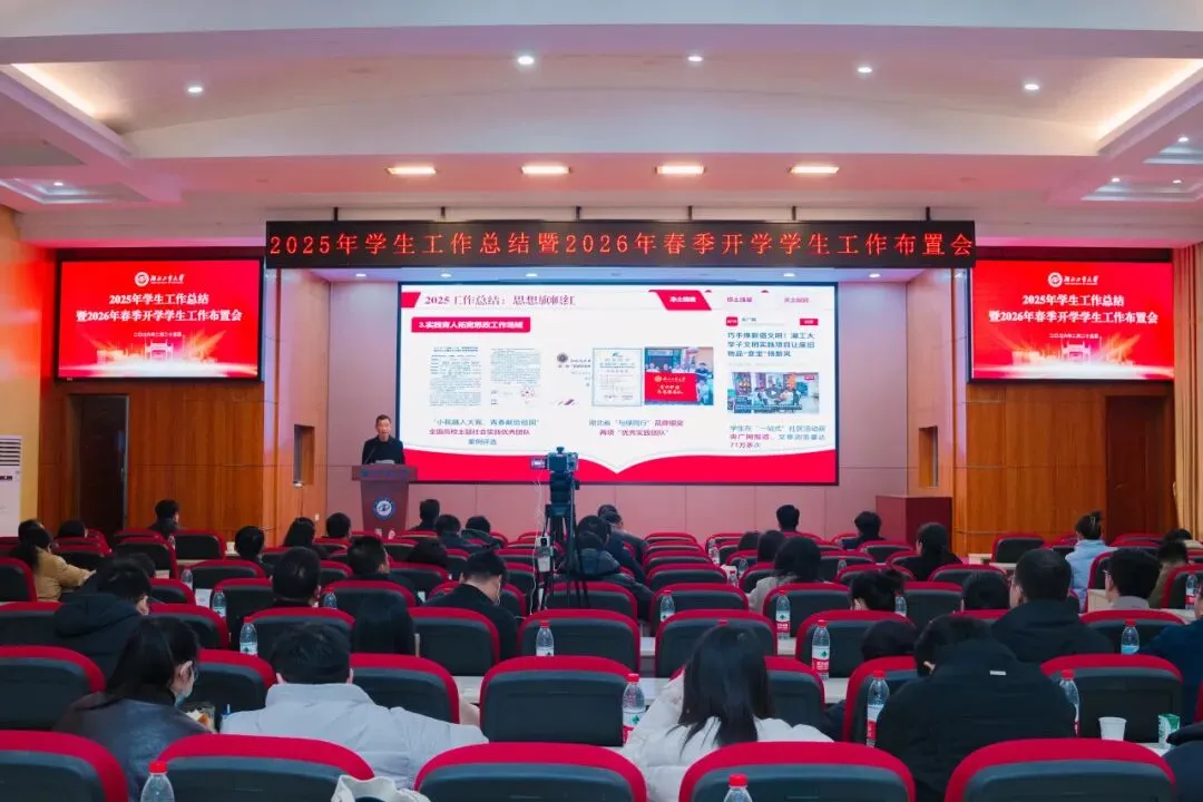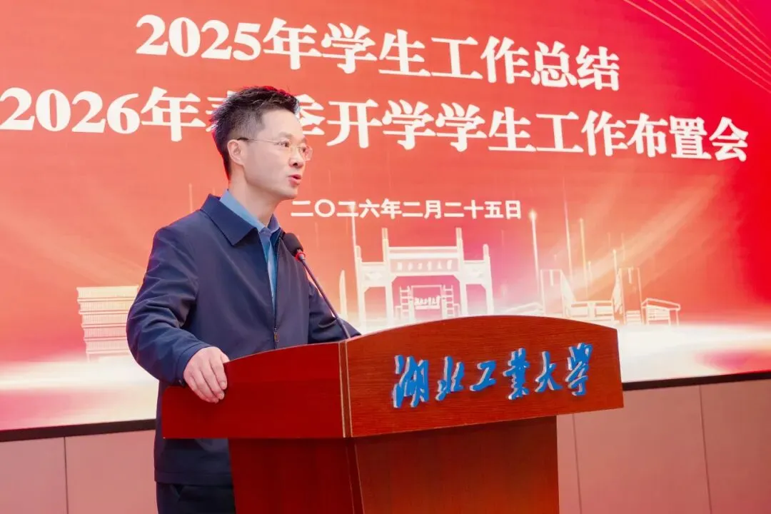 任卫华以“强调”“感悟”“展望”三个关键词与大家作分享交流,强调开学工作千头万绪,安全稳定重于泰山,请各单位将学生安全抓在经常、融入日常,织密校园安全防护网,确保新学期平稳有序。感悟13个学院的工作汇报充分体现了湖工大学生工作的扎实根基、鲜明特色与前瞻思考,同绘就思政育人工作的生动画卷。展望2026年,要全面实施“1239”工程:紧扣立德树人根本任务,强化“一站式”学生社区2.0建设和高素质辅导员队伍建设,筑牢“三条轴线”,全力守牢“底线”、做强“主线”、跃升“高线”,聚力实施“九项行动”,为学校高质量发展贡献学工力量。