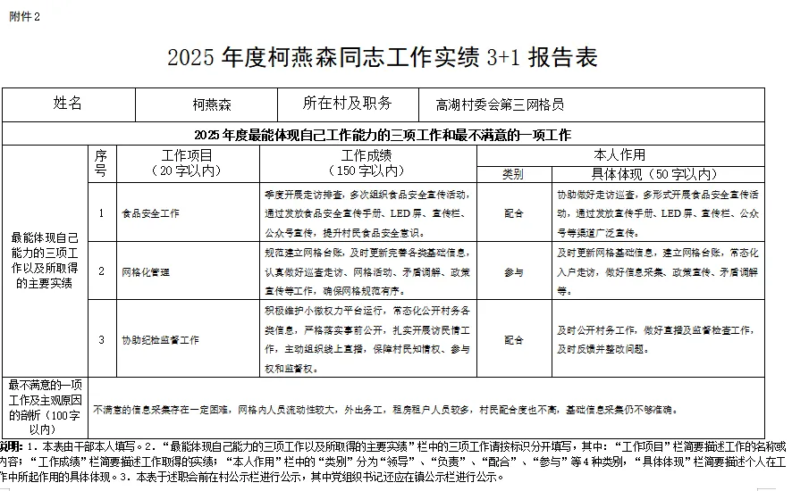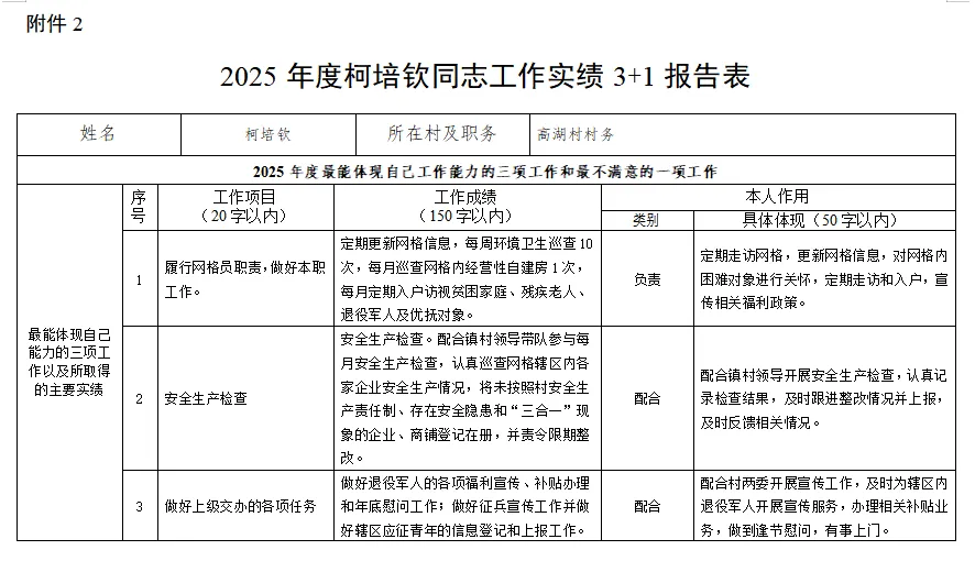 2025年度高湖村“两委”班子及工作人员工作实绩“3+1”报告表公示