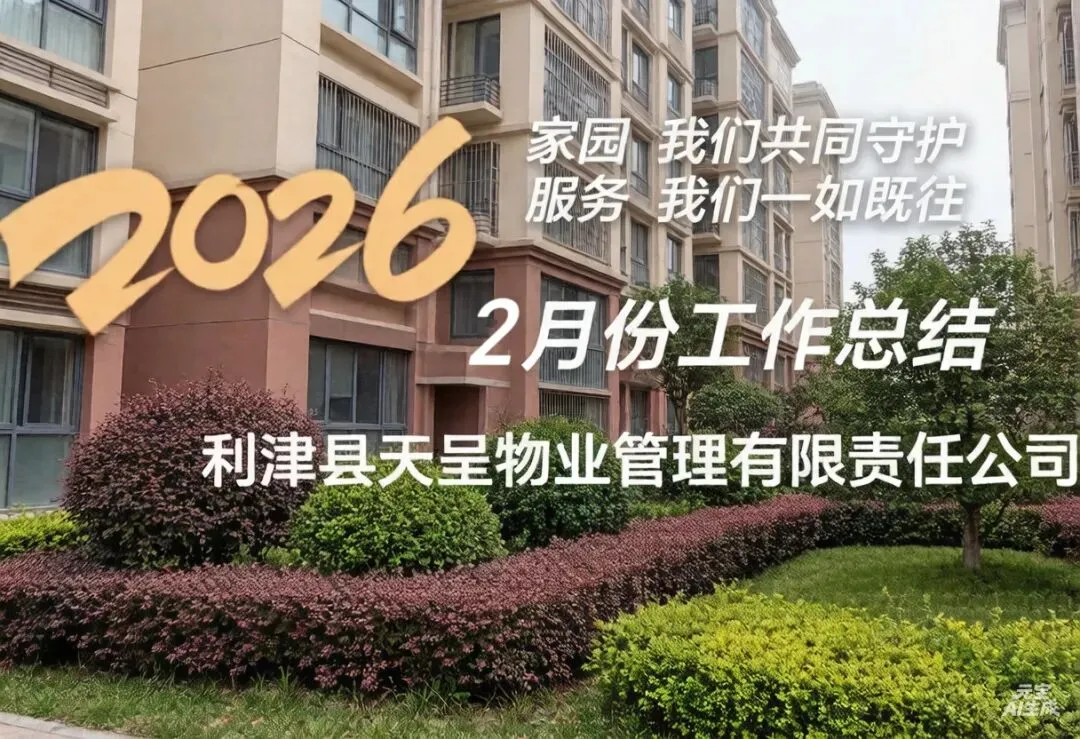 2026年2月,恰逢春节假期与节后复工关键节点,天呈物业围绕节日保障、安全管理、业主服务、环境维护等重点工作,全体员工坚守岗位、高效履职,确保园区生活日常平稳有序、安心过大年。现将本月工作开展情况总结如下: