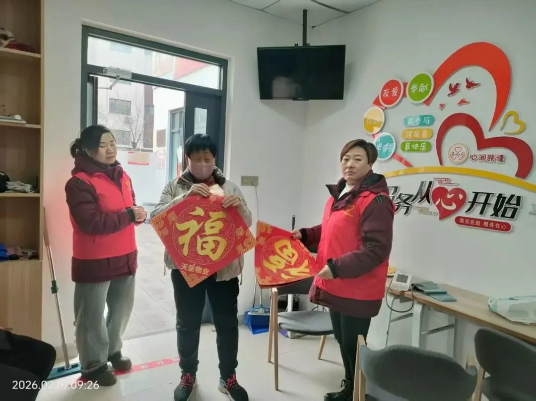 为了提高小区老年人的生活品质,便利日常生活,天呈物业秉承“优+您的生活”服务理念,始终如一构建小区和谐互助的邻里氛围。天呈志愿服务队2026年2月份为小区老人义务理发、测血压、维修、缝补衣物等便民服务活动如期开始了,新春来临之际也把象征喜庆吉祥的大红福字早早送到她们手中。