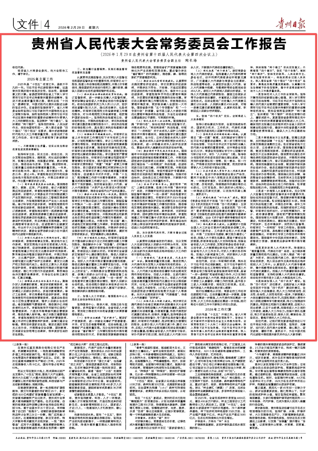 2025年是“十四五”收官之年,是极不平凡的一年。习近平总书记亲临贵州考察,这是贵州发展历程中极具历史性、标志性、里程碑意义的大事。省委团结带领全省上下深入学习贯彻习近平总书记考察贵州重要讲话精神,坚定不移走高质量发展之路,顺利实现“十四五”圆满收官,中国式现代化贵州实践迈出新的坚实步伐。在省委的坚强领导下,省人大常委会始终坚持以习近平新时代中国特色社会主义思想为指导,始终坚持把深入贯彻习近平总书记在贵州考察时的重要讲话精神作为贯穿人大工作的鲜明主线,坚定拥护“两个确立”、坚决做到“两个维护”,坚持党的领导、人民当家作主、依法治国有机统一,深入落实省委“四个强化”“四个担当”总要求,稳中求进推动新时代地方人大工作高质量发展,全面完成了各项工作任务,各方面工作都取得了新进展新成效。