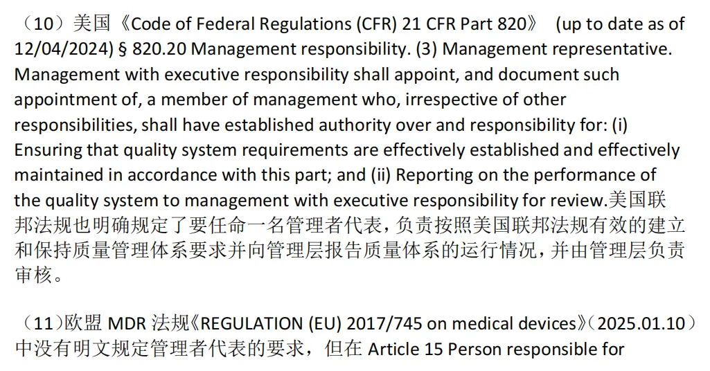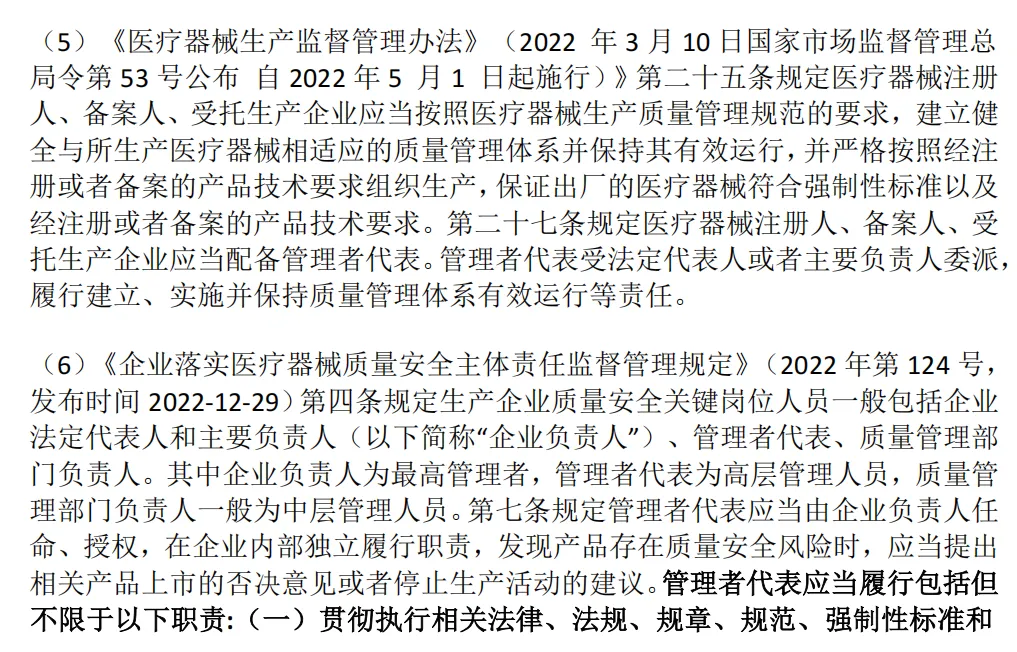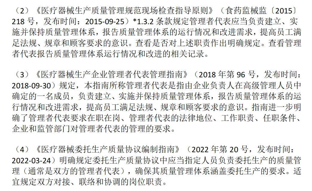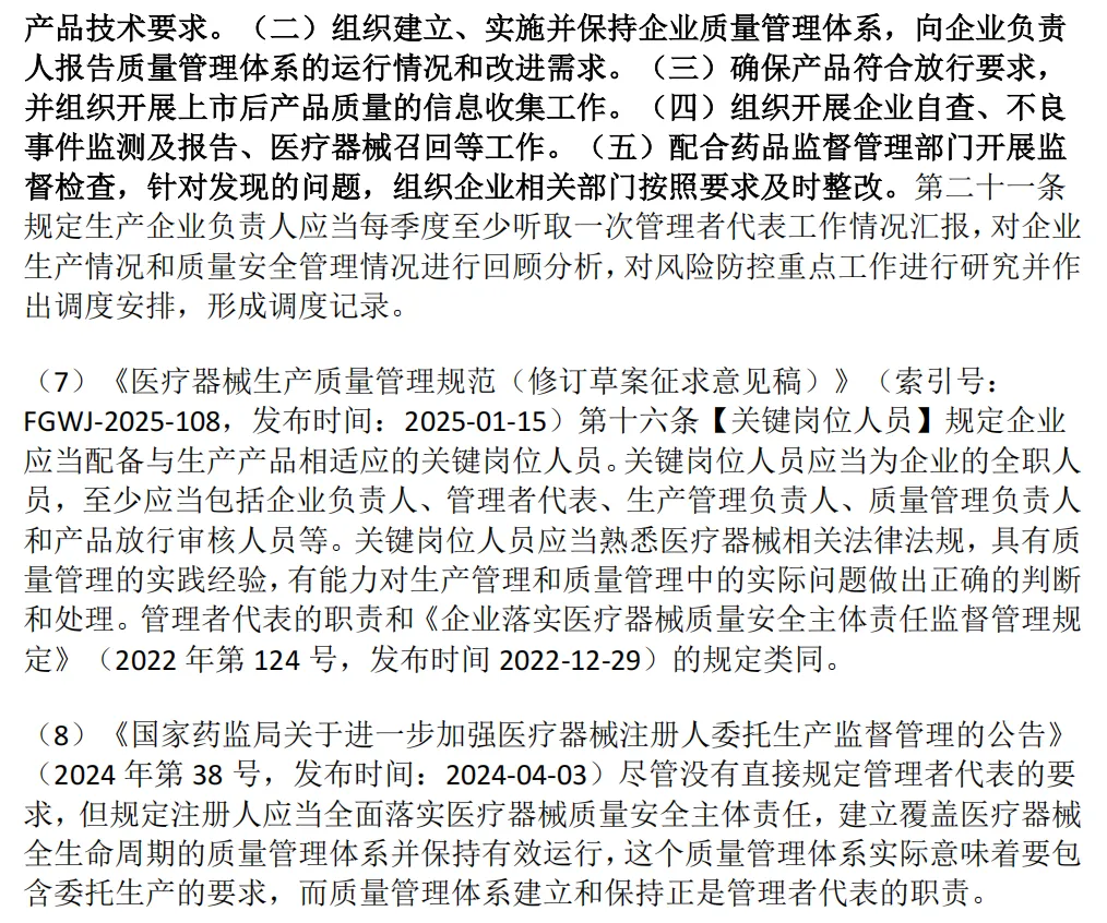 (1)《医疗器械生产质量管理规范》(2025年第107号,发布时间:2025-11-04)第十九条规定企业负责人应当确定一名管理者代表。管理者代表负责建立、实施并保持质量管理体系,报告质量管理体系的运行情况和改进需求,提高员工满足法规、规章和顾客要求的意识。