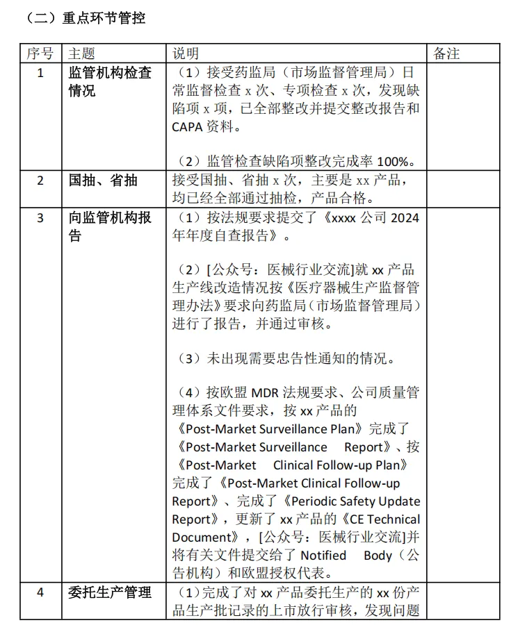 3 | 医疗器械不良事件监测内部专项检查 | (1)按照《医疗器械不良事件监测和再评价管理办法》(国家市场监督管理总局令第1号,发布时间:2018-08-31)、《国家药监局综合司关于印发医疗器械注册人备案人开展不良事件监测工作检查要点的通知》(药监综械管〔2021〕43号,发布日期:2021-04-09)、[公众号:医械行业交流]《国家药监局关于发布医疗器械注册人开展不良事件监测工作指南的通告》(2020 年第25 号,发布时间:2020-04-10)、《国家药监局关于发布医疗器械定期风险评价报告撰写规范的通告》(2020 年第46 号,发布时间:2020-07-02)、《国家药监局关于发布医疗器械注册人开展产品不良事件风险评价指导原则的通告》(2020 年第78 号,发布时间:2020-11-27)等法规要求开展内部专项检查。 (2)根据国家医疗器械不良事件监测信息平台中医疗器械不良事件的统计分析情况,重点对xx产品开展深度穿透式检查。 | 质量部负责 |