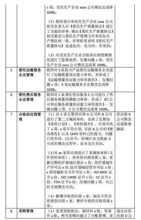 5 | 继续对重点供应商进行监督检查 | (1)跟踪供应商B公司的整改情况,若在xx年x月x日之前还未关闭,将暂停合格供应商资质,暂停财务结算。 (2)根据供货质量统计情况,继续检查5家主要供应商的质量管理情况,其中,对于供应商D公司进行现场检查,对于D公司的供货产品要求D公司提供完整的出厂检测报告和检测记录。 | 采购部、质量部负责 |
