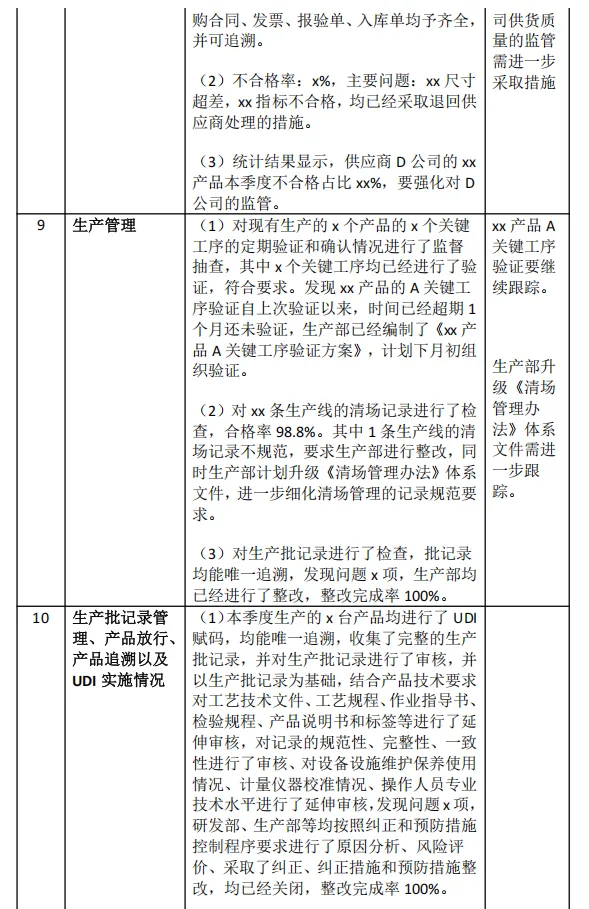 2 | 对产品生产工艺技术文件进行专项检查 | (1)应当按照建立的质量管理体系进行生产,以保证产品符合强制性标准和经注册或者备案的产品技术要求是法规的监管红线,而产品的设计开发文件的正确性、一致性、完整性、准确性就需要研发部严格审核、批准。 (2)xx产品A关键工序验证要继续跟踪检查。 (3)生产部升级《清场管理办法》体系文件需进一步跟踪检查。 | 研发部、注册部、质量部、生产部负责 |