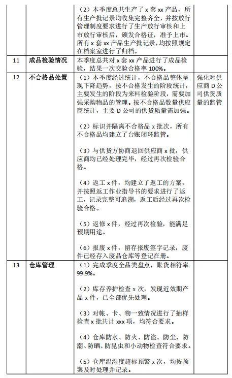 4 | 全面质量管理体系自查 | 迎接药监局年度监督检查,开展全面自查,完成法律法规合规性内部审核,输出审核报告。 | 质量部负责 |