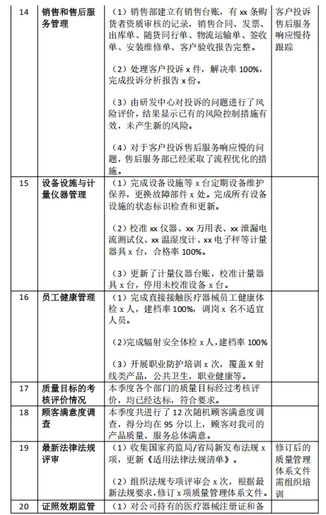 (1)上季度出现的xx产品风险预警信号,已经于20xx年x月x日由质量部组织相关部门进行了风险分析和评价,结果显示,现有风险控制措施继续有效,并未产生新的风险,于20xx年x月x日提交了《xx产品风险评价报告》,并通过了xx省医疗器械不良事件监测中心审核。