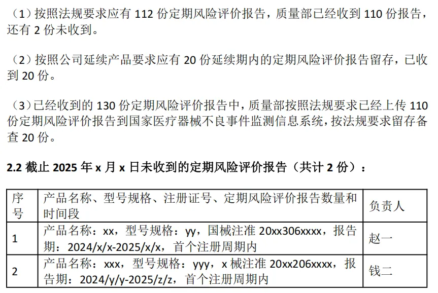 5 | x台计量器具超期未校准 | (1)建立计量器具台账预警功能,提前30天提示校准。 (2)组织了对与之有关的医疗器械检验检测结果进行了追溯和有效性评价,并采取复检措施,复检结果显示合格,表明“超期未校准”未对医疗器械质量造成安全、有效风险(完成时间:20xx年x月x日)。 | 质量部负责 |