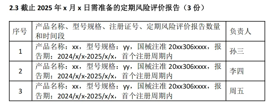 1 | 抓紧推动变更注册 | 根据《国家药品监督管理局关于GB 9706.1-2020及配套并列标准、专用标准实施有关工作的通告》(2023年第14号,发布时间:2023-03-16)的规定,已经获得二类和三类医疗器械产品注册证需在2026年5月1日之前完成变更注册,已经不到一年时间,涉及我司二类注册证2张,三类注册证1张,为了避免注册证失效带来的风险,要求注册部抓紧推进变更注册的各项工作。 | 注册部负责 |
