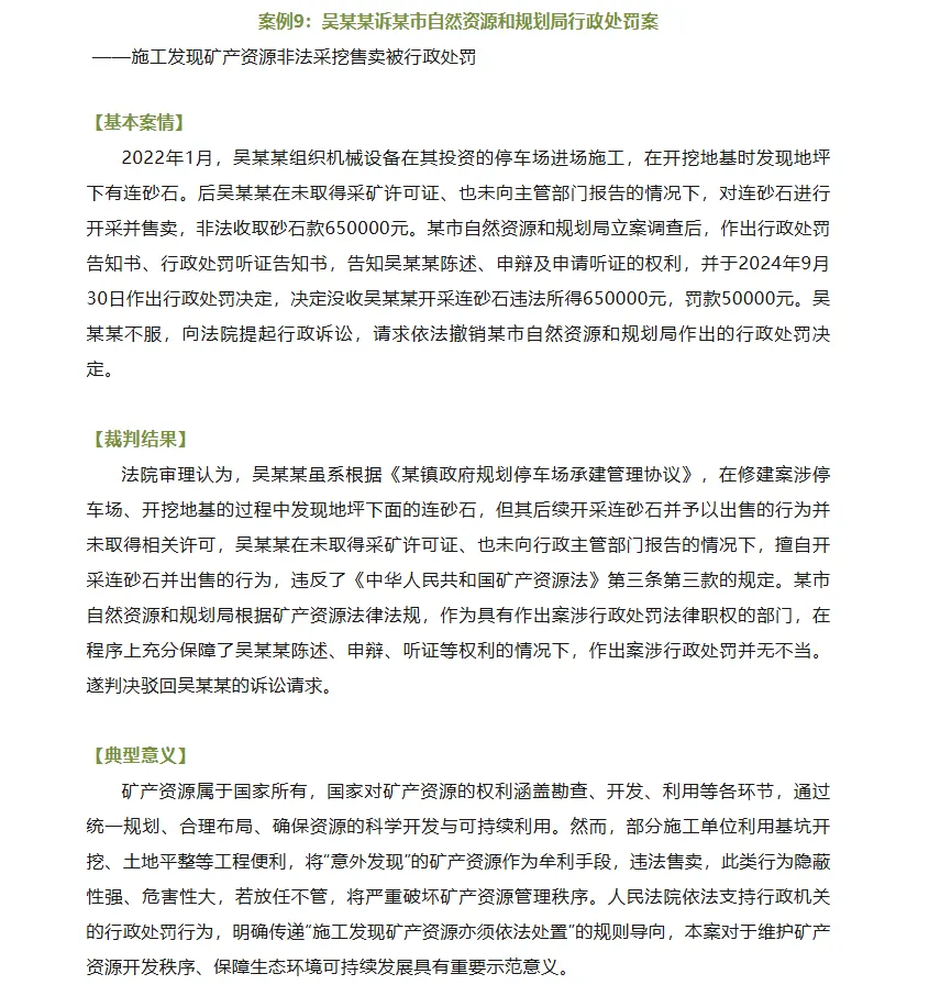 本案明确“施工过程中意外发现矿产资源必须依法报告与处置”的核心规则,有效解决实践中的监管难题。判决旗帜鲜明地支持行政机关的合法履职,坚决否定以“意外发现”为借口的非法牟利行为,对规范矿产资源开发秩序、遏制类似隐蔽性违法行为具有重要的司法示范和行业警示作用。