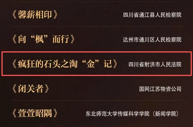 2025年中国微电影大典“金蜂鸟奖”三微比赛由中宣部、国家广电总局等16个部委单位联合指导,是国内微电影领域的权威赛事。射洪法院作为非专业队伍,从全国超过3000部参赛作品中脱颖而出,《疯狂的石头之淘“金”记》等三部作品荣获微视频、微电影单元三等奖。同时,《疯狂的石头之淘“金”记》被评为川渝法治“三微”优秀作品。