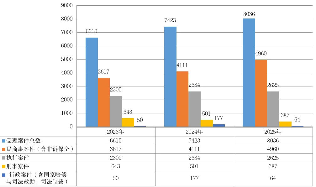 受理案件8036件 ↑同比去年上升8.26%审执结6968件 ↑ 同比去年上升0.14%
