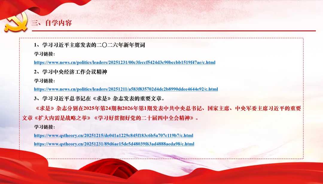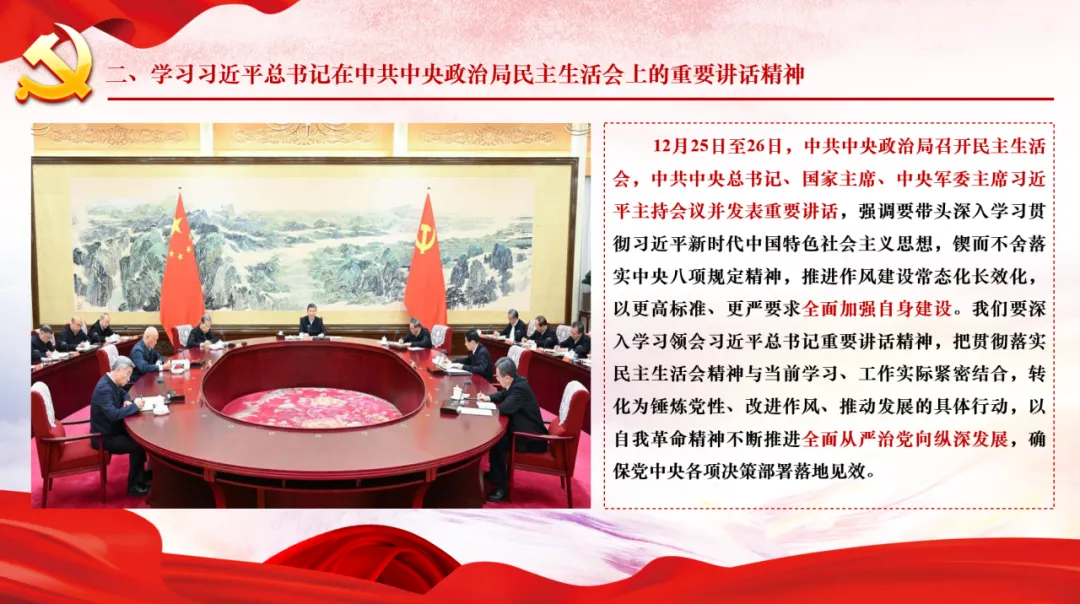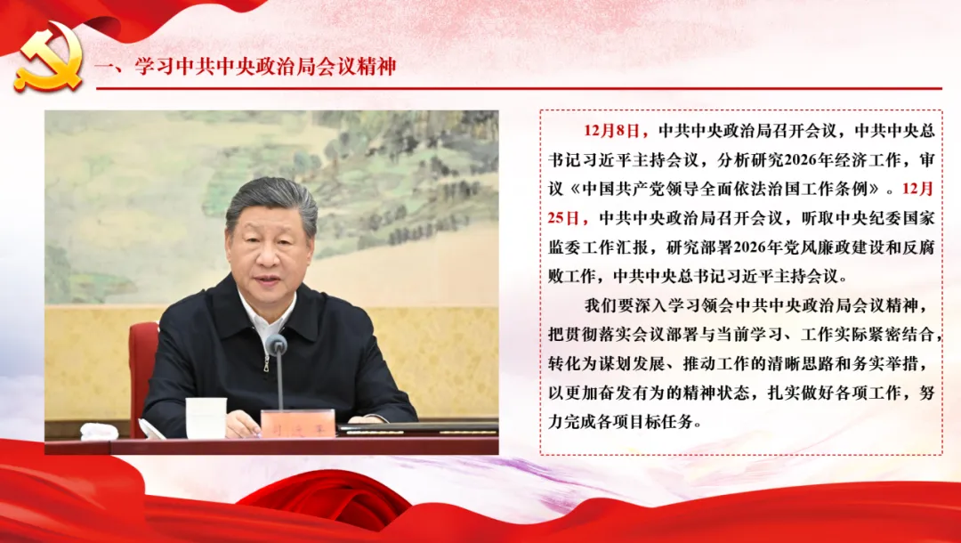 2025年12月8日,中共中央政治局召开会议,中共中央总书记习近平主持会议,分析研究2026年经济工作,审议《中国共产党领导全面依法治国工作条例》。12月25日,中共中央政治局召开会议,听取中央纪委国家监委工作汇报,研究部署2026年党风廉政建设和反腐败工作,中共中央总书记习近平主持会议。