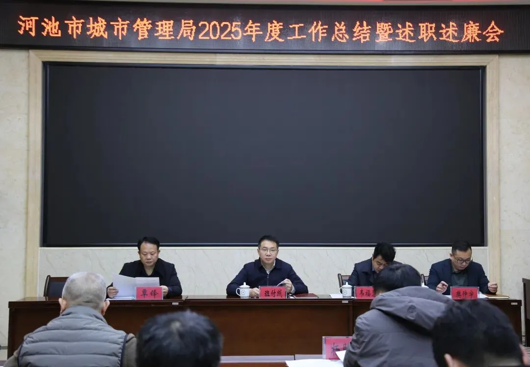 2月25日上午,河池市城市管理局召开2025年度工作总结暨述职述廉会,全面回顾2025年城市管理工作成效,深入查摆存在的问题与不足,科学部署2026年重点工作任务。此次会议以视频形式召开,局领导班子及各科室、二层单位干部职工分别在宜州区、金城江区办公区会场参会。
