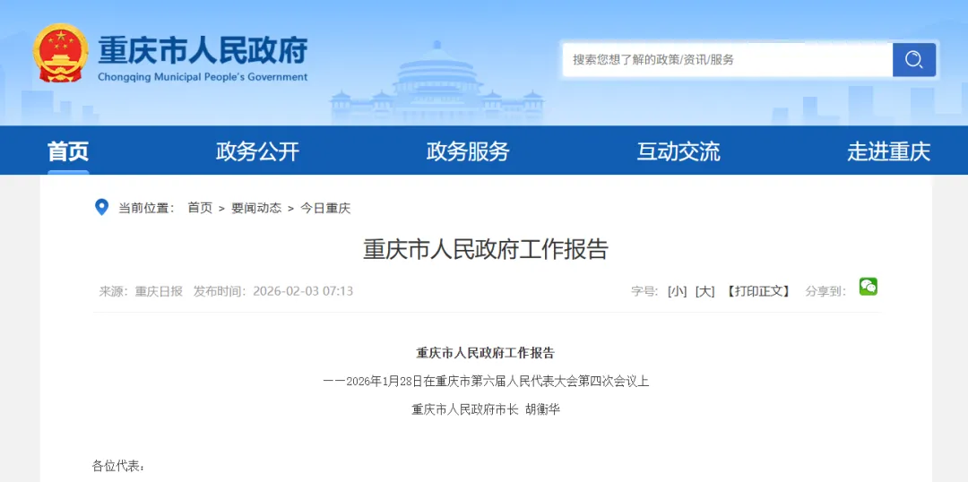 2026年1月28日,重庆市人民政府市长胡衡华在重庆市第六届人民代表大会第四次会议上作政府工作报告。报告多次提及低空经济,并表明,2026年将加快建设北斗低轨星网系统,构建通导遥一体化时空信息服务枢纽,探索推动超大城市低空综合治理改革,构建智慧低空一体化治理体系,迭代升级低空智能网联系统,拓展商文旅体、空中交通等应用场景,打造低空经济创新发展强市。同时打造成渝绵“科技创新金三角”、成渝中线科创走廊,扩容提质成渝“氢走廊”“电走廊”“智行走廊”,建设成渝低空经济带。现将《2026年重庆市政府工作报告》全文分享如下。