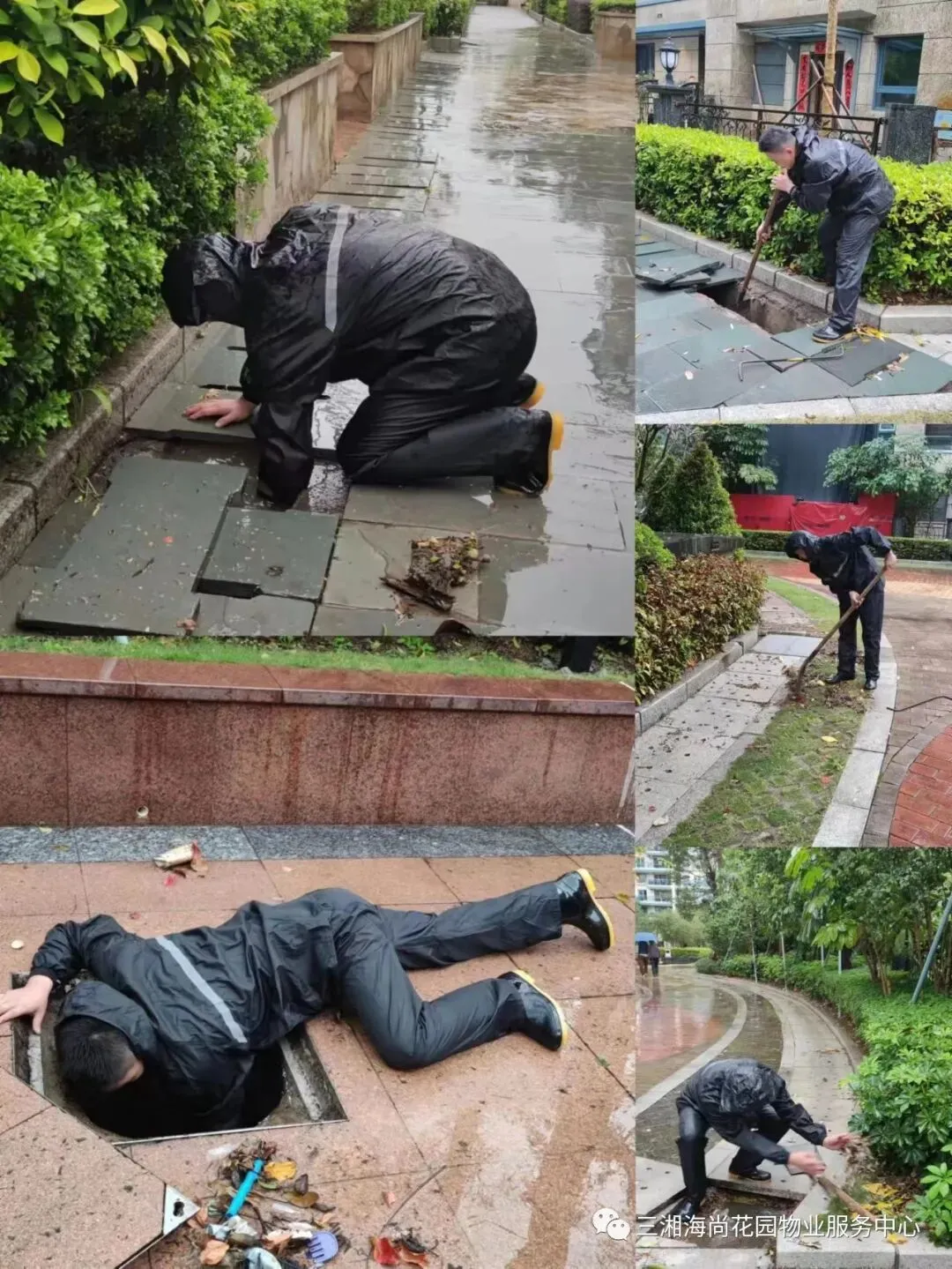 暴雨中,巡查各排水口,发现有流水不畅问题,及时清理,防止水浸给您出行带来不便,杜绝因水浸而造成的财产损失。