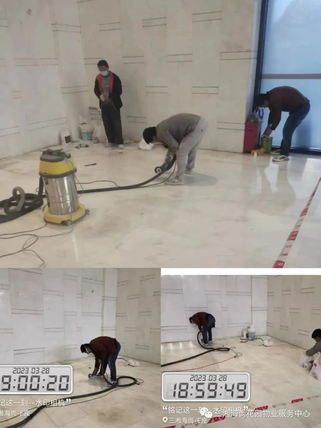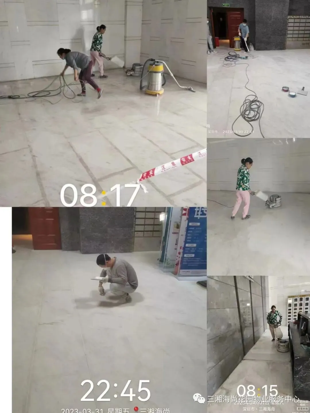 通过专业的养护人员,对大堂地面的大理石进行养护,打磨,抛光、镜面养护。