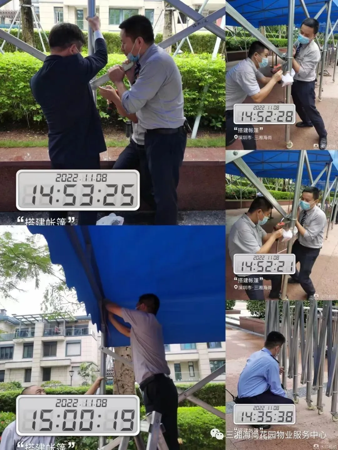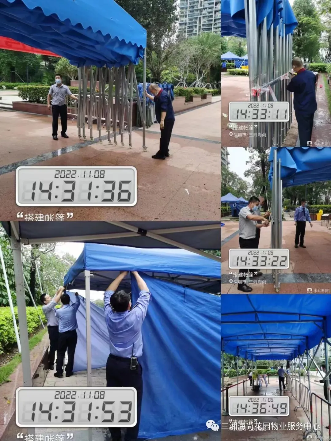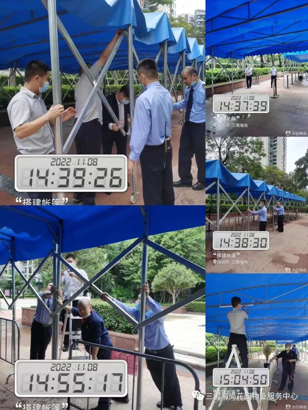 1、核酸点位的帐篷搭建。牢固、遮风、挡雨的帐篷是核酸现场的重要资源,自9月26日核酸点移到小区内,原来的一批帐篷经过风吹日晒后,已破损严重。为了让大家在核酸现场排队做核酸的时候,烈日和下雨都安然无恙,我们重新搭建了更加牢固的、占地面积更大的帐篷。