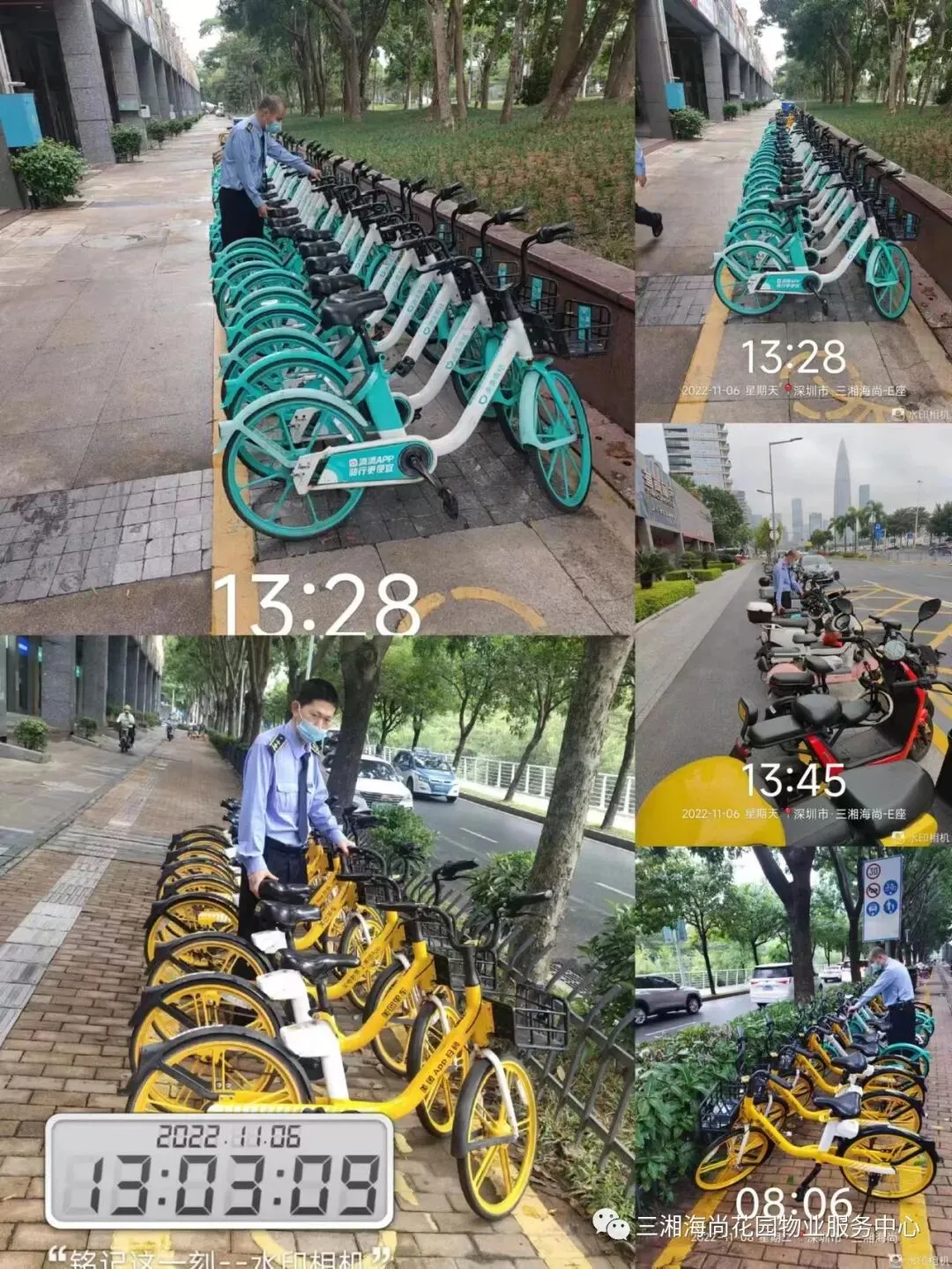 外围共享单车整理,保障整体环境整洁,人行通道畅通。