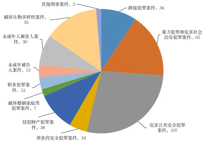贯彻总体国家安全观,全力维护社会安全稳定,受理刑事案件387件,同比下降22.75%,审结353件,判处罪犯424人、罚金498.45万元。
