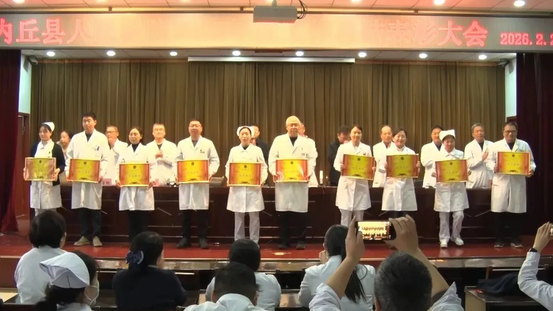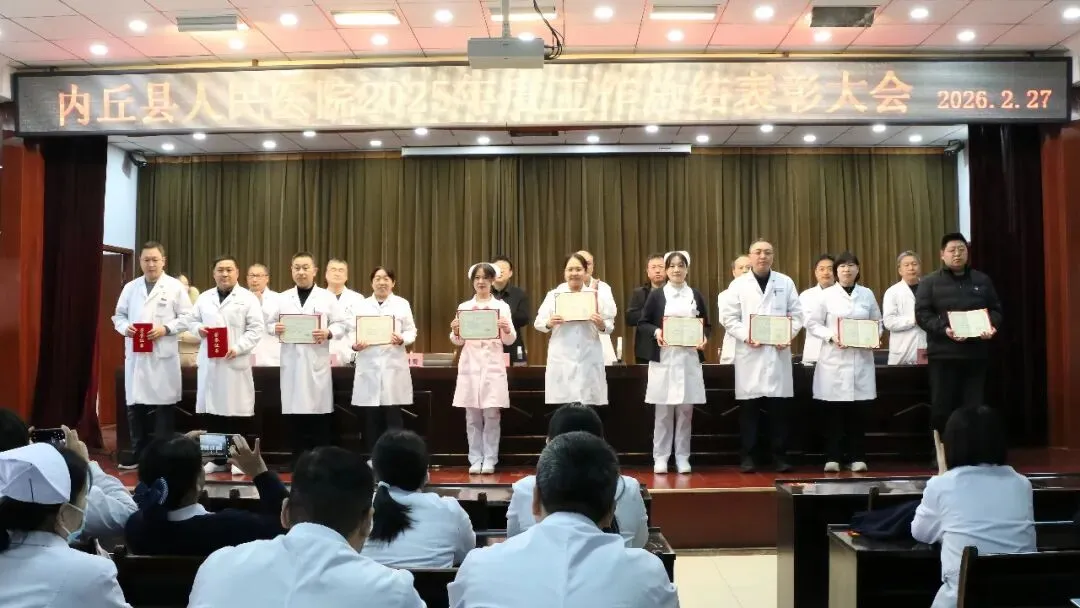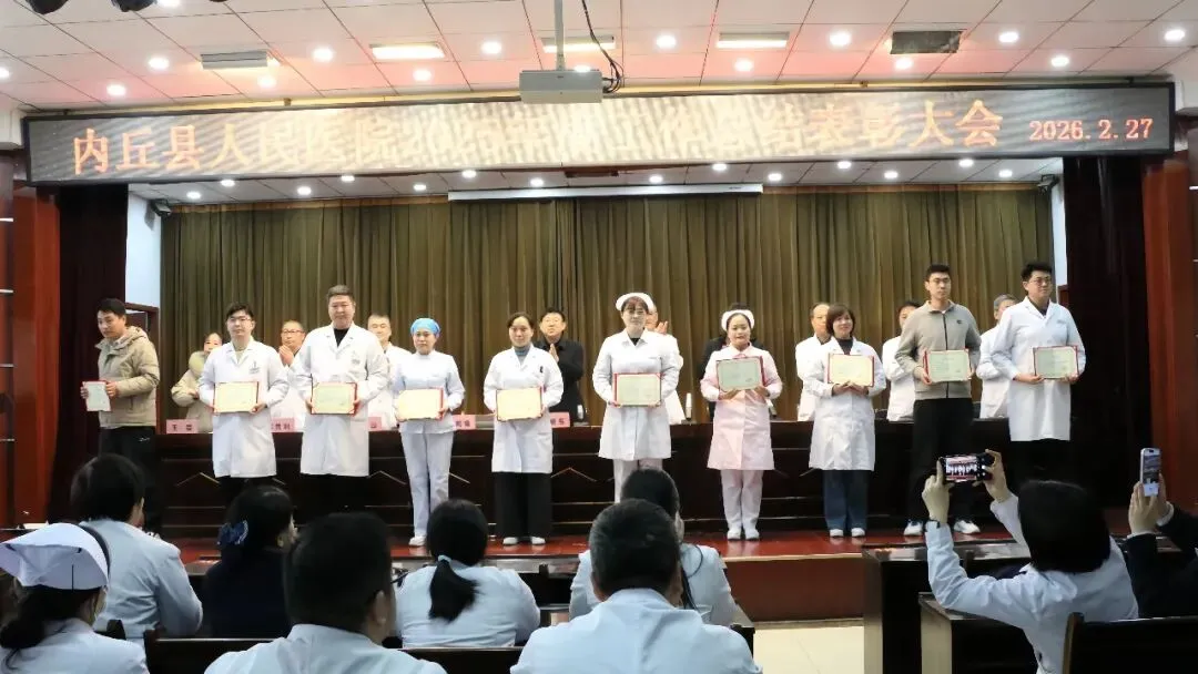 荣获2025年度“服务之星”人员(从左往右依次):葛常亮(外一科)、陈云亭(内四科)、智玉国(手麻科)、王明方(儿科)、赵爱国(产科)、李荣静(内七科)、王长雪(内五科)、房磊(外四科)、邱艳静(内一科)、管昕(急诊科)