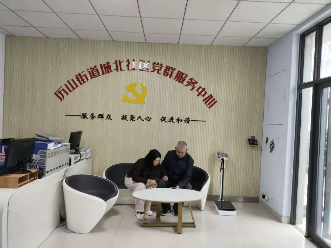 社区工作人员帮助老年居民操作手机完成退休认证,便民服务暖民心。