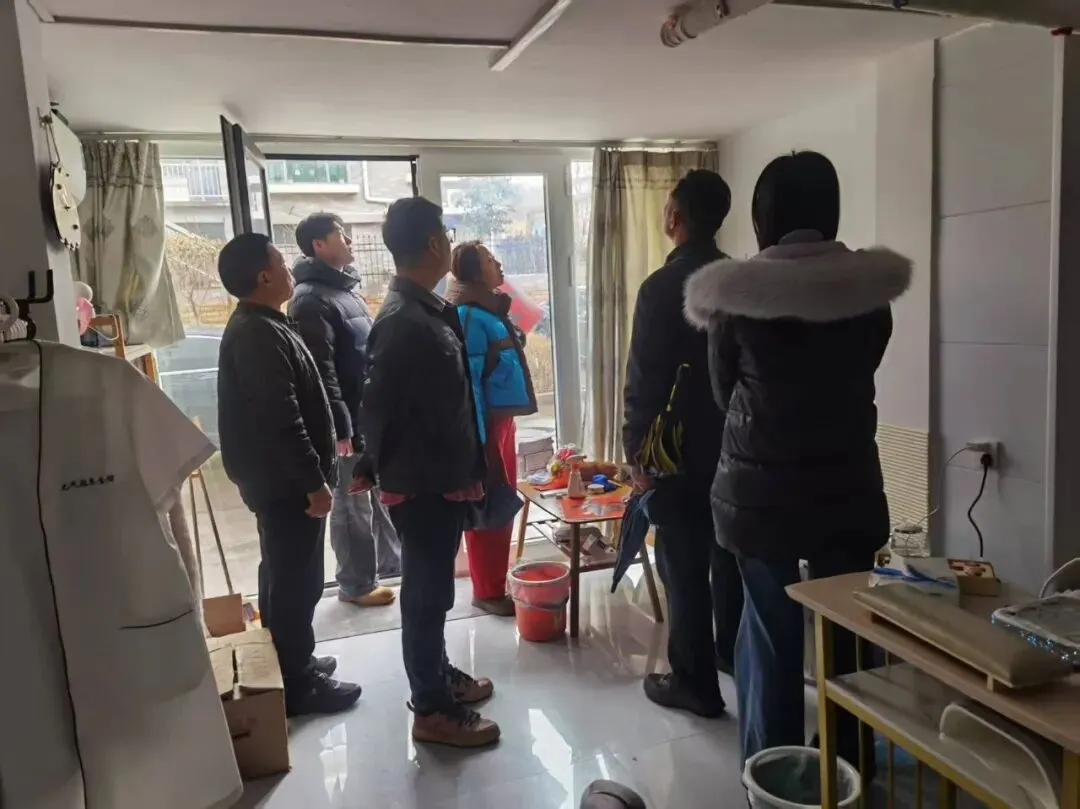 社区网格员与物业、施工队一起实地查看居民家中漏水情况并协助居民申请公共维修基金。