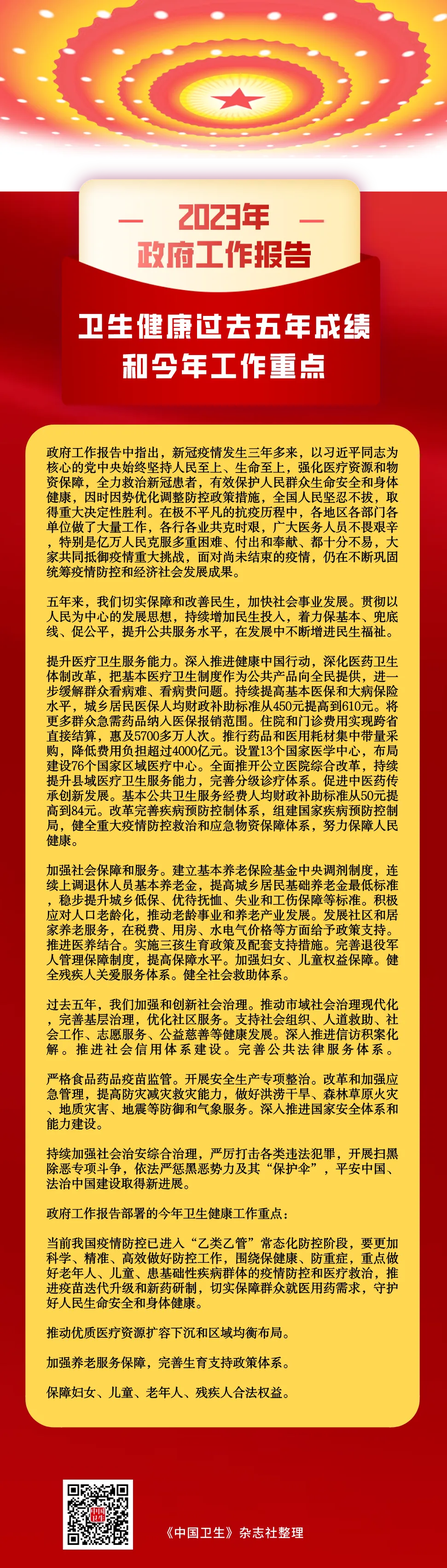 在回顾过去一年和五年工作时,《政府工作报告》指出:过去一年,我国经济发展遇到疫情等国内外多重超预期因素冲击。在党中央坚强领导下,我们高效统筹疫情防控和经济社会发展,根据病毒变化和防疫形势,优化调整疫情防控措施。国家在提升医疗卫生服务能力方面,深入推进健康中国行动,深化医药卫生体制改革,把基本医疗卫生制度作为公共产品向全民提供,进一步缓解群众看病难、看病贵问题。持续提高基本医保和大病保险水平,城乡居民医保人均财政补助标准从450元提高到610元。将更多群众急需药品纳入医保报销范围。住院和门诊费用实现跨省直接结算,惠及5700多万人次。推行药品和医用耗材集中带量采购,降低费用负担超过4000亿元。设置13个国家医学中心,布局建设76个国家区域医疗中心。全面推开公立医院综合改革,持续提升县域医疗卫生服务能力,完善分级诊疗体系。基本公共卫生服务经费人均财政补助标准从50元提高到84元。改革完善疾病预防控制体系,组建国家疾病预防控制局,健全重大疫情防控救治和应急物资保障体系,努力保障人民健康。加强社会保障和服务方面,积极应对人口老龄化,推动老龄事业和养老产业发展。推进医养结合。实施三孩生育政策及配套支持措施。加强妇女、儿童权益保障。健全残疾人关爱服务体系。健全社会救助体系。对今年政府工作的建议,《政府工作报告》重点提出三方面一是关于疫情防控。《政府工作报告》指出,当前我国疫情防控已进入“乙类乙管”常态化防控阶段,要更加科学、精准、高效做好防控工作,围绕保健康、防重症,重点做好老年人、儿童、患基础性疾病群体的疫情防控和医疗救治,推进疫苗迭代升级和新药研制,切实保障群众就医用药需求,守护好人民生命安全和身体健康。实际上将当前“乙类乙管”常态化防控阶段的疫情防控工作重点讲得清清楚楚。二是关于加快推进医疗卫生服务体系建设。《政府工作报告》在保障基本民生和发展方面,提出推动优质医疗资源扩容下沉和区域均衡布局。尽管只有“推动优质医疗资源扩容下沉和区域均衡布局”一句话19个字,但却道出了今年乃至今后几年加快推进医疗卫生服务体系建设的核心任务,就是围绕推动优质医疗资源扩容下沉和区域均衡布局来进行,这里的“扩容”既包括优质医疗资源覆盖和辐射范围的扩大,还包括辐射带动能力的提升,既包括医疗服务能力,也包括医防融合能力;所谓“下沉”,说的是优质医疗资源扩容的方向,即向下走,既包括国家医学中心、区域医疗中心跨省向薄弱地区的转移,也包括省内优质资源向地市的聚集,还包括县域优质资源向乡镇村的辐射,最终实现区域均衡布局的目标。三是关于积极应对人口老龄化和人口资源均衡。《政府工作报告》指出,加强社会事业加强养老服务保障,完善生育支持政策体系。保障妇女、儿童、老年人、残疾人合法权益。在2022年首次出现人口负增长的大背景下,做好人口工作尤为重要。正如《政府工作报告》指出的那样,过去五年极不寻常、极不平凡。我们也期待中国医疗卫生健康领域继续往前推进,走向更好的未来。