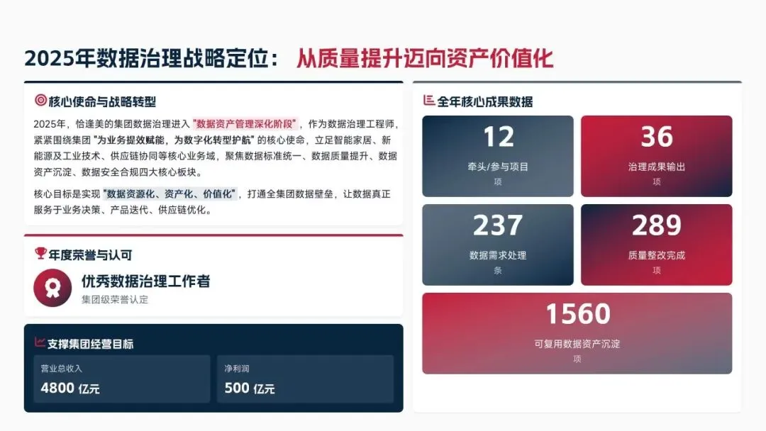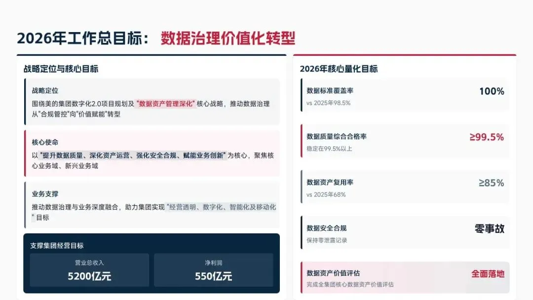 2025年美的集团数据治理进入资产管理深化阶段,核心战略从质量提升迈向资产价值化,围绕标准统一、质量提升、资产沉淀、安全合规四大板块推进工作,助力集团实现营收4800亿元、净利润500亿元目标,相关工作获集团级优秀数据治理工作者认定,同时也梳理出五大核心问题,2026年将推动数据治理从合规管控向价值赋能转型,支撑集团营收5200亿元、净利润550亿元的经营目标。