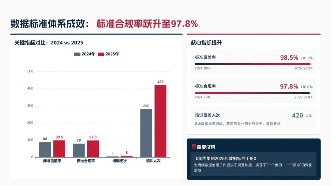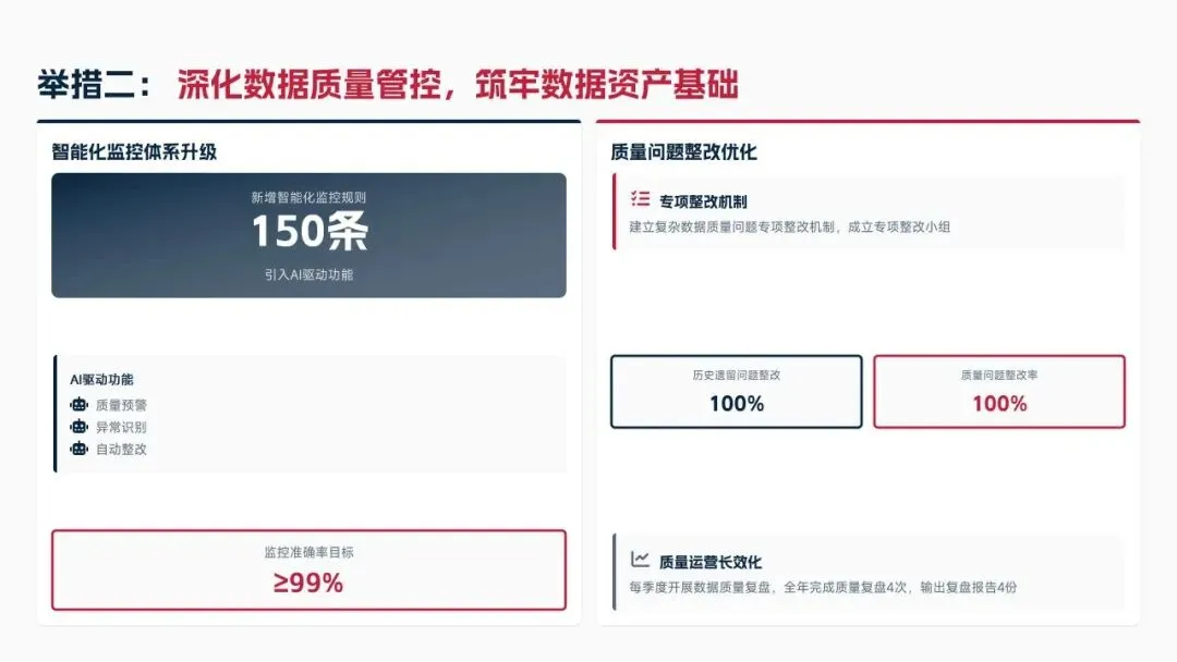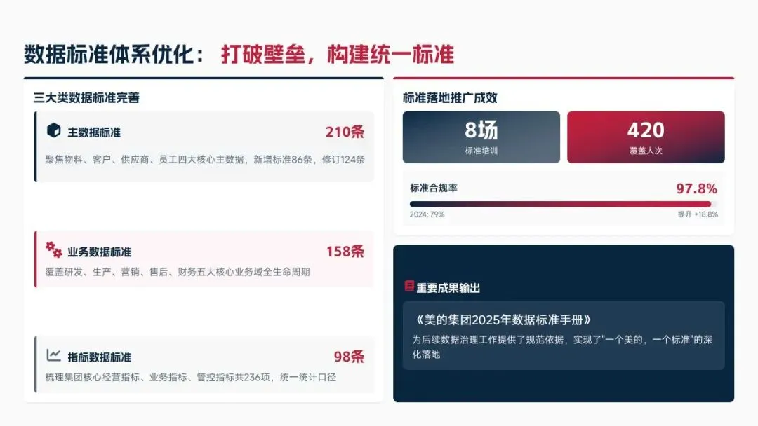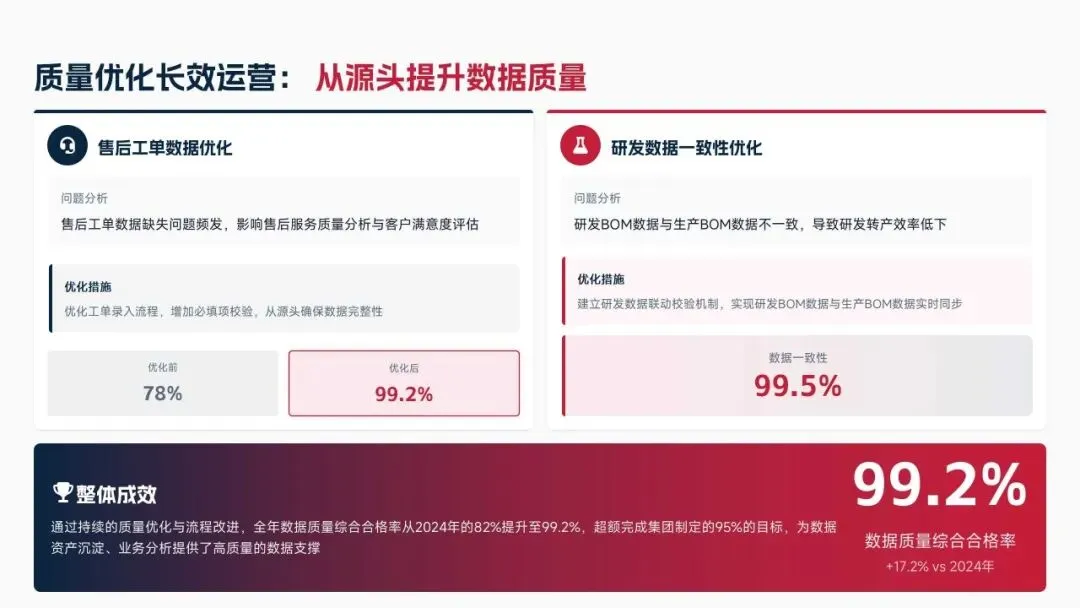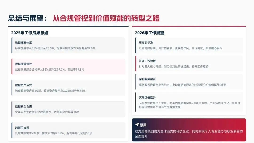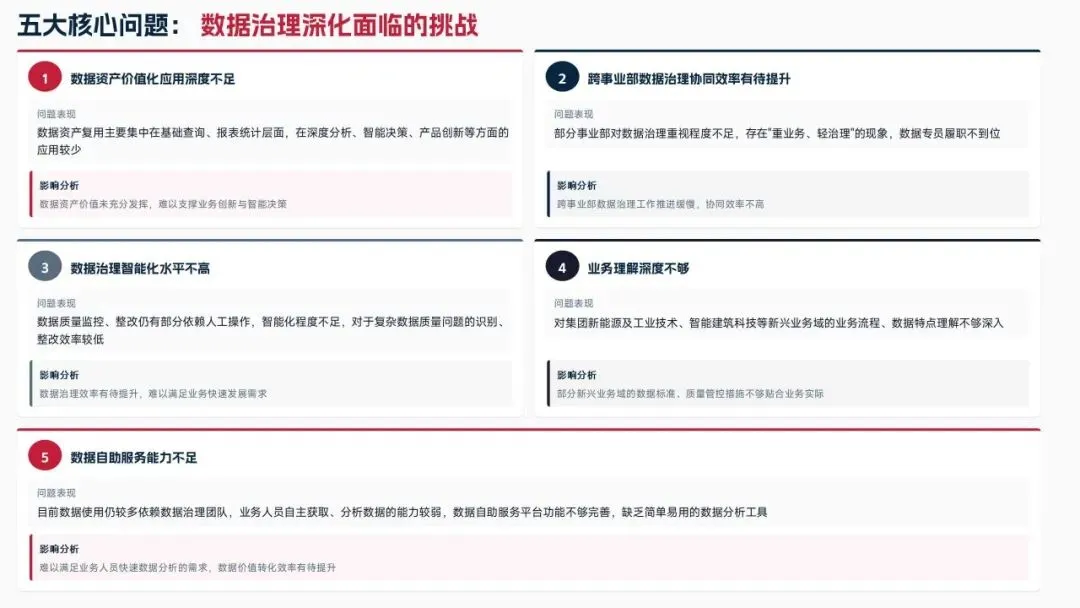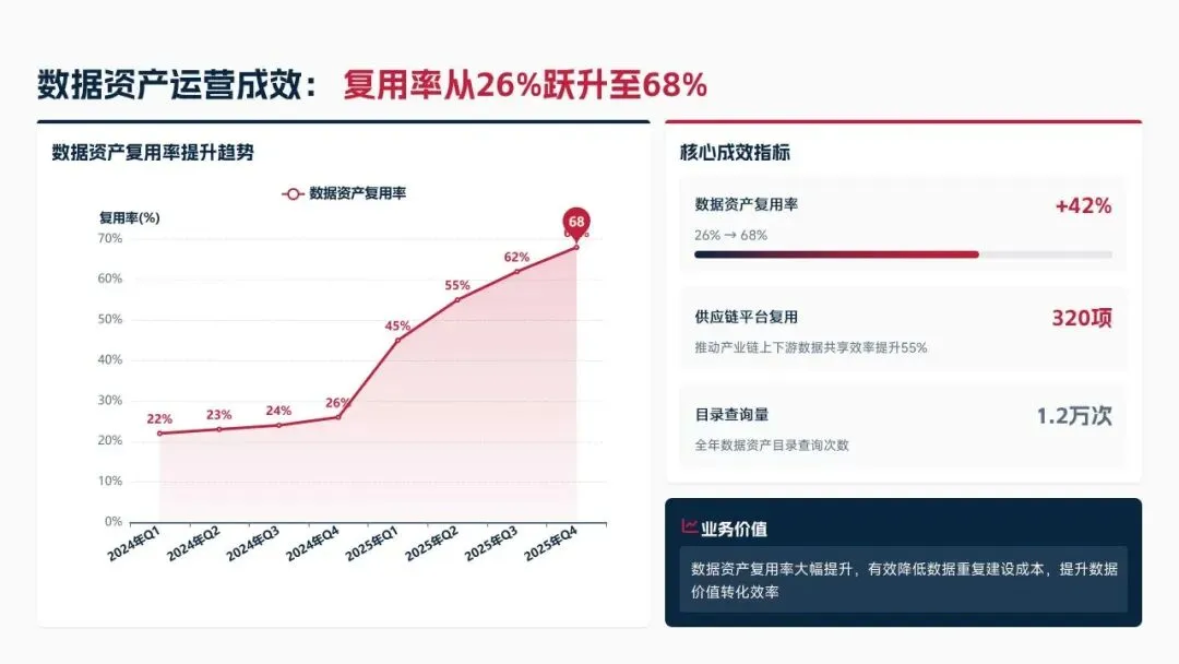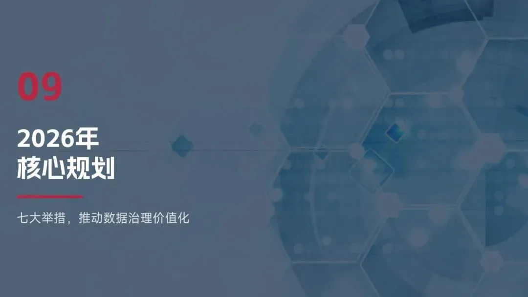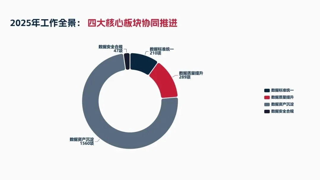 2025年落地三大类数据标准466条,搭建数据质量全流程闭环管理体系,沉淀1860项数据资产、创造超5亿元业务价值,实现数据安全零泄露,跨部门处理237条数据需求,交付率98.7%。但也存在资产价值化应用浅、跨事业部协同效率低、治理智能化水平不高等问题。