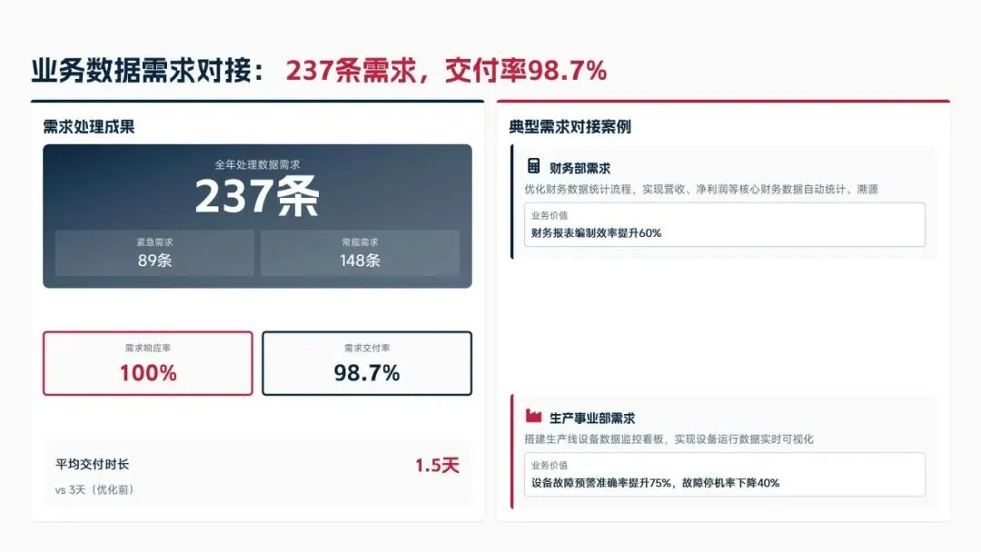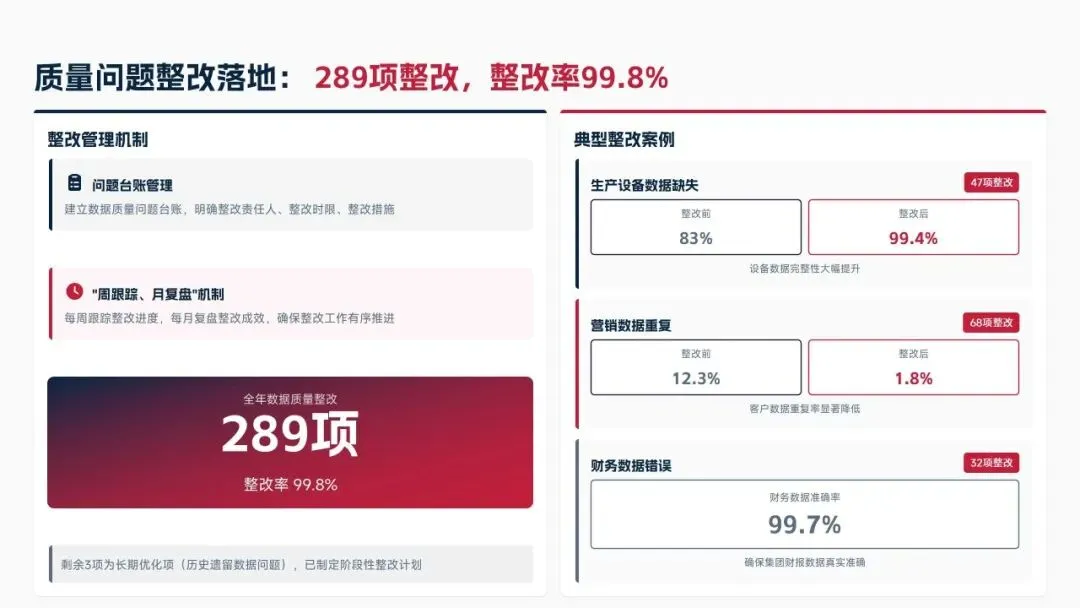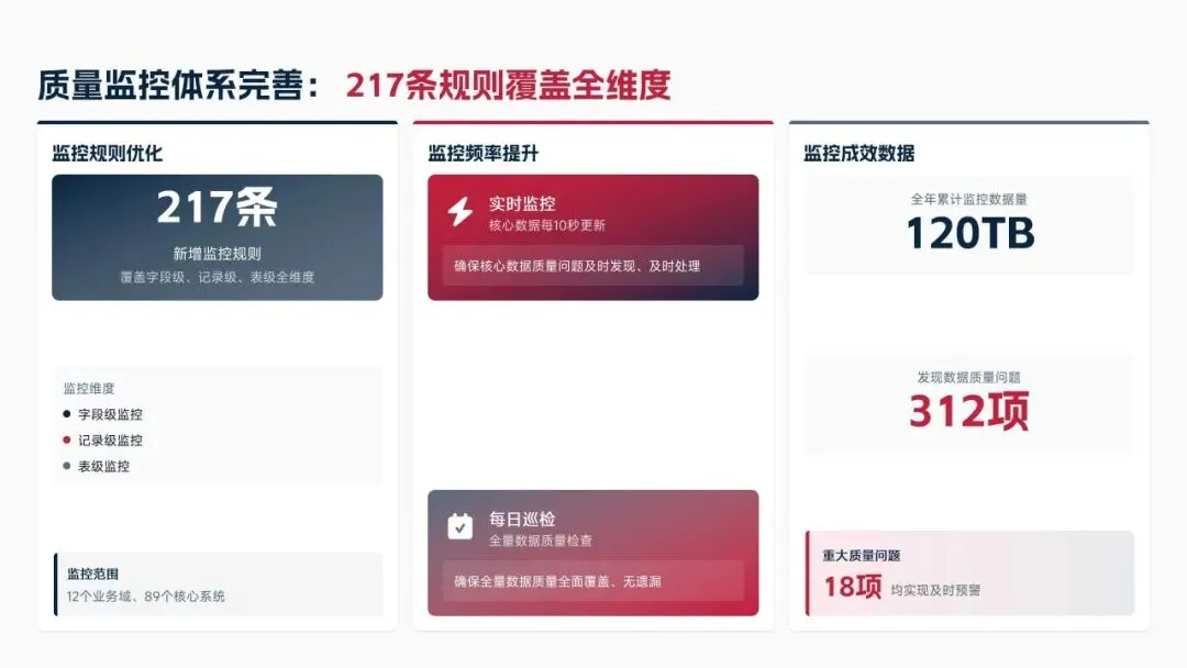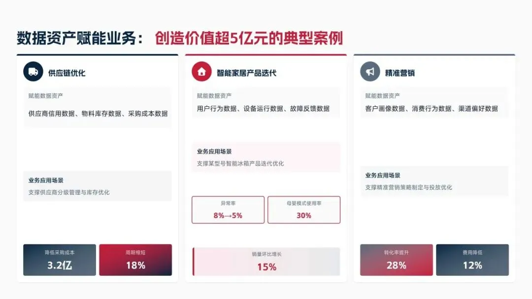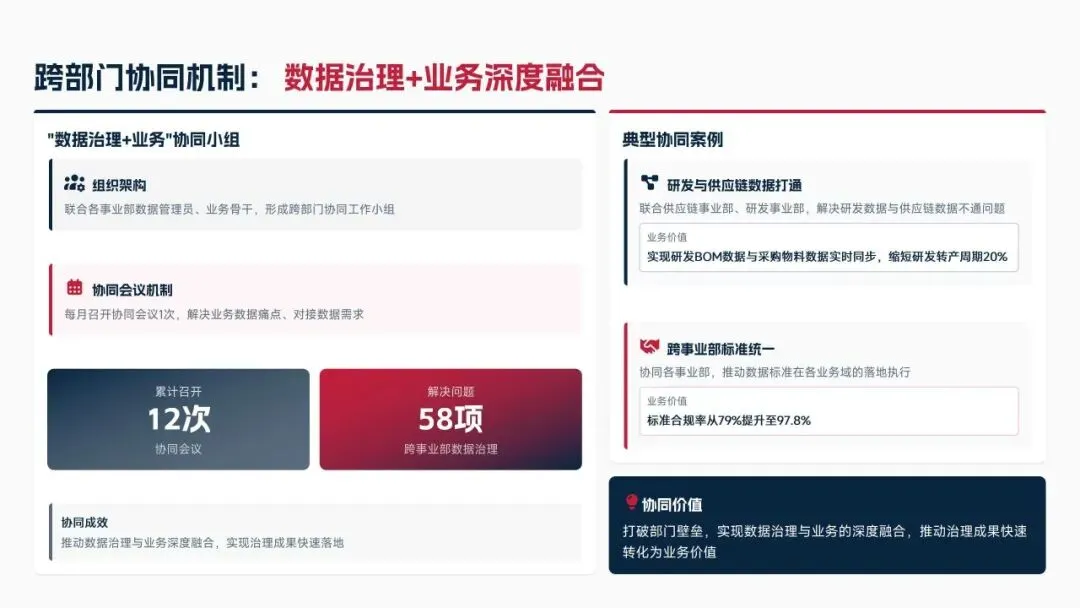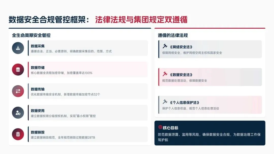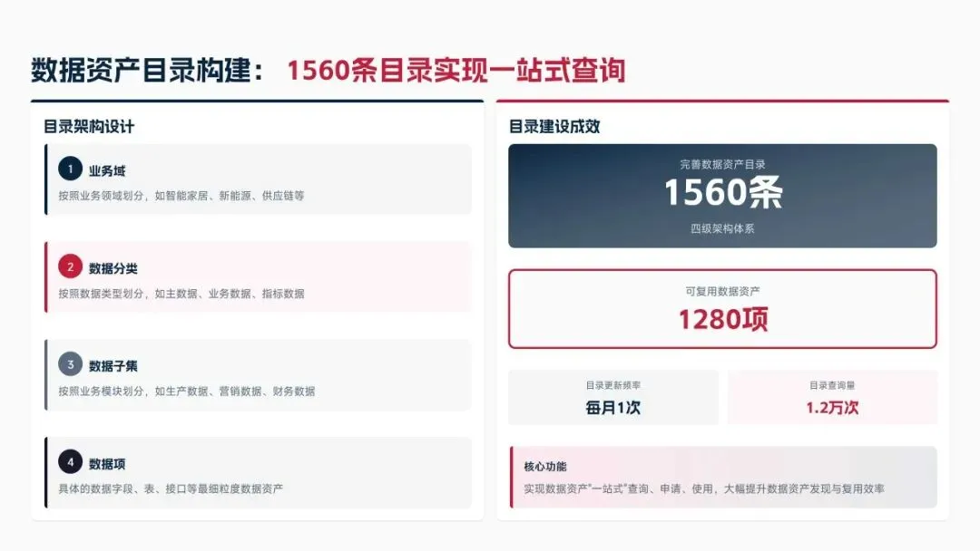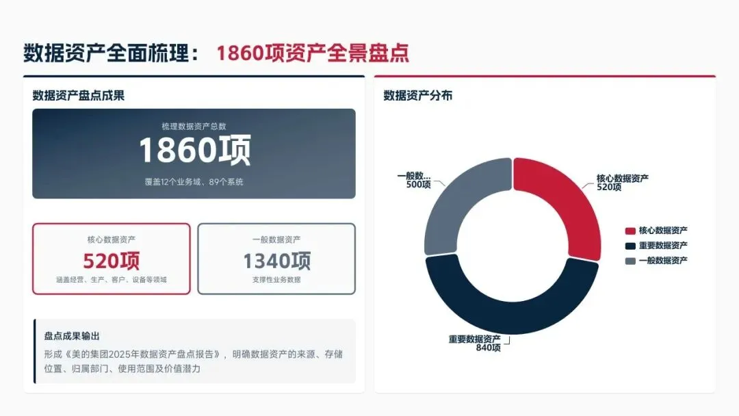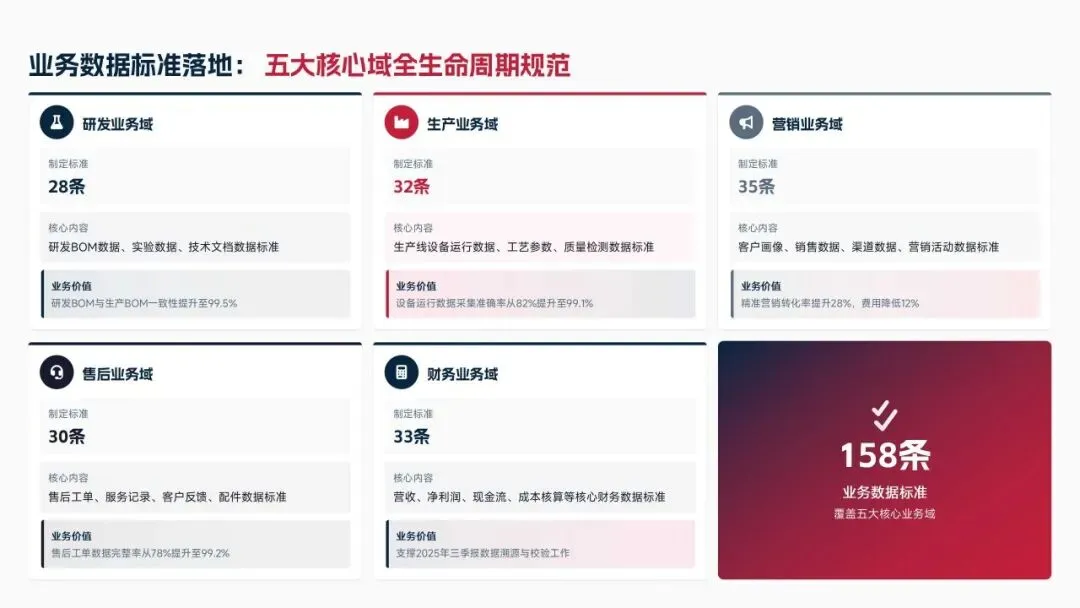 2025年落地三大类数据标准466条,搭建数据质量全流程闭环管理体系,沉淀1860项数据资产、创造超5亿元业务价值,实现数据安全零泄露,跨部门处理237条数据需求,交付率98.7%。但也存在资产价值化应用浅、跨事业部协同效率低、治理智能化水平不高等问题。