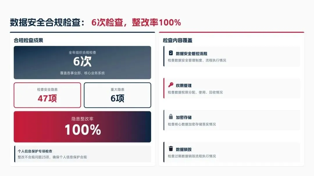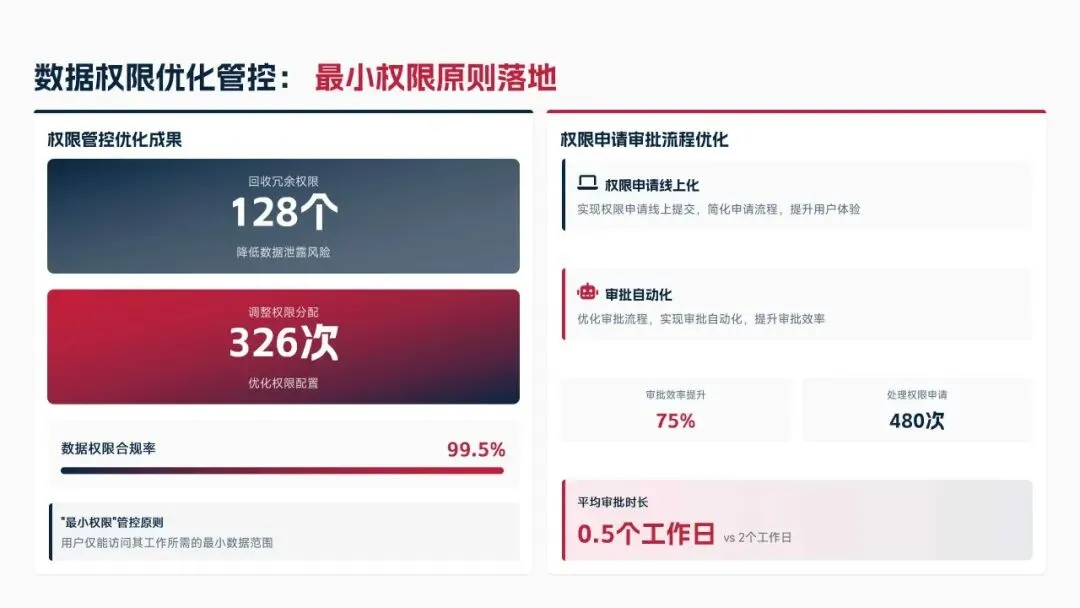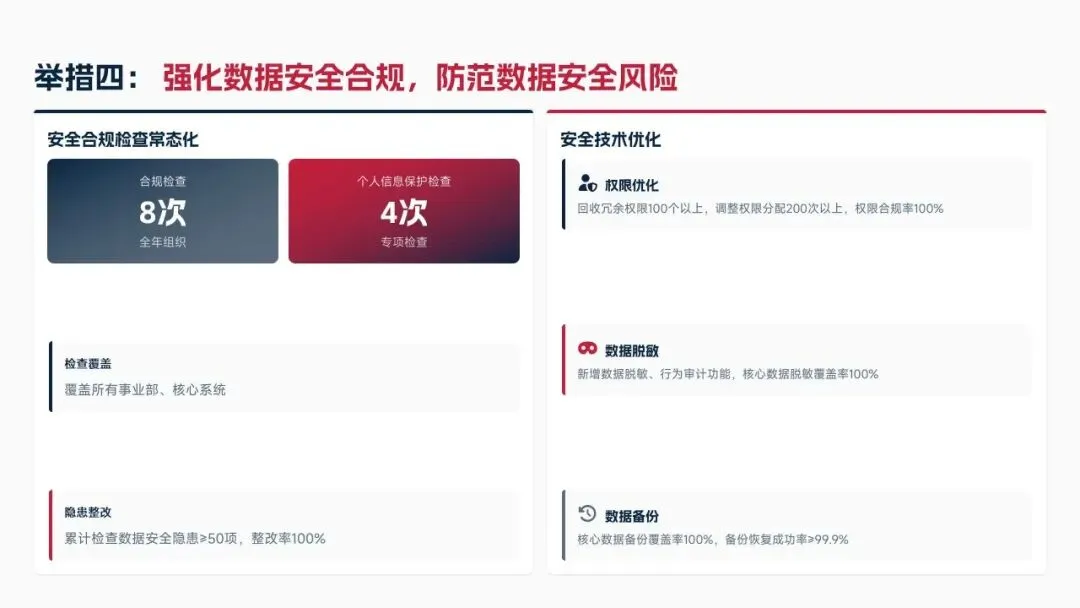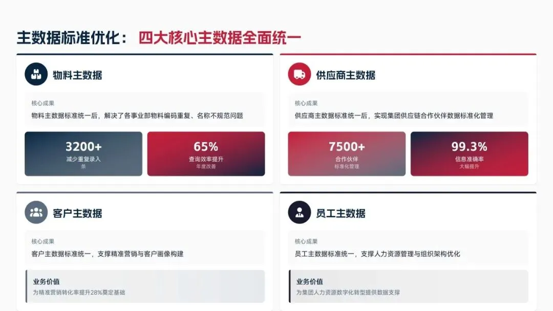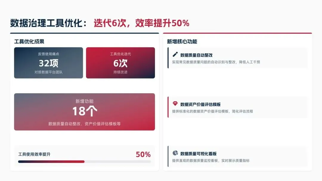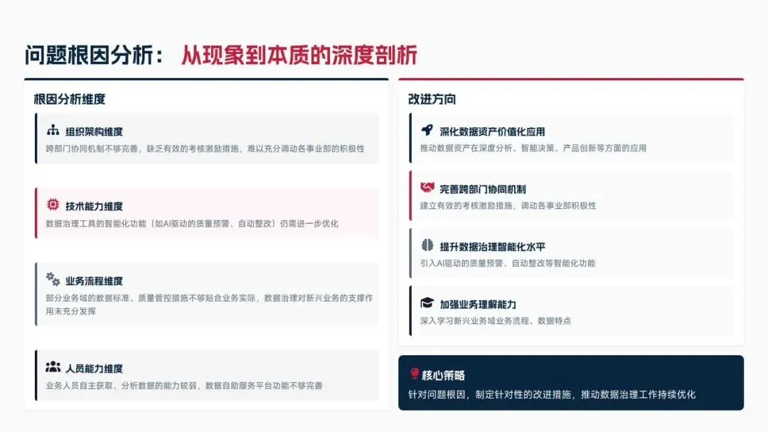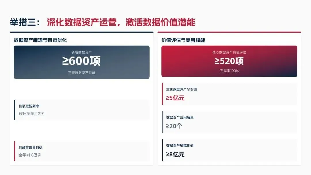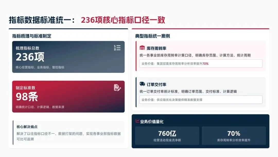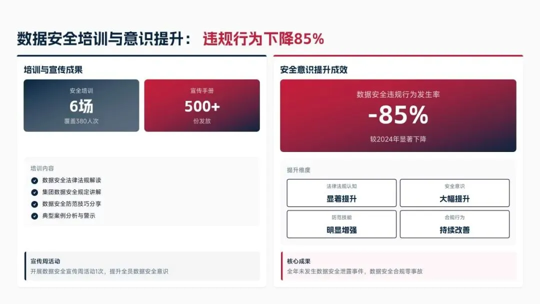 2025年落地三大类数据标准466条,搭建数据质量全流程闭环管理体系,沉淀1860项数据资产、创造超5亿元业务价值,实现数据安全零泄露,跨部门处理237条数据需求,交付率98.7%。但也存在资产价值化应用浅、跨事业部协同效率低、治理智能化水平不高等问题。