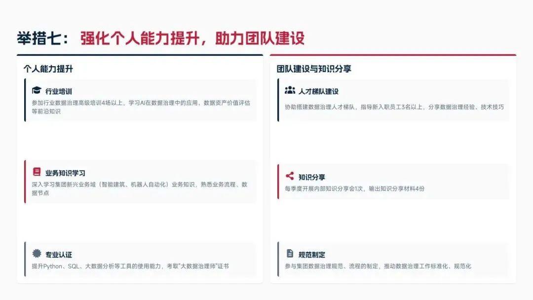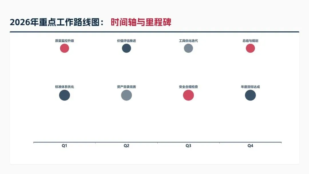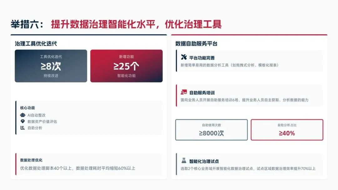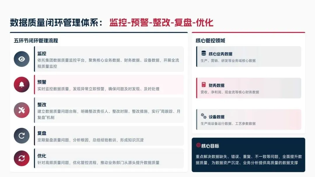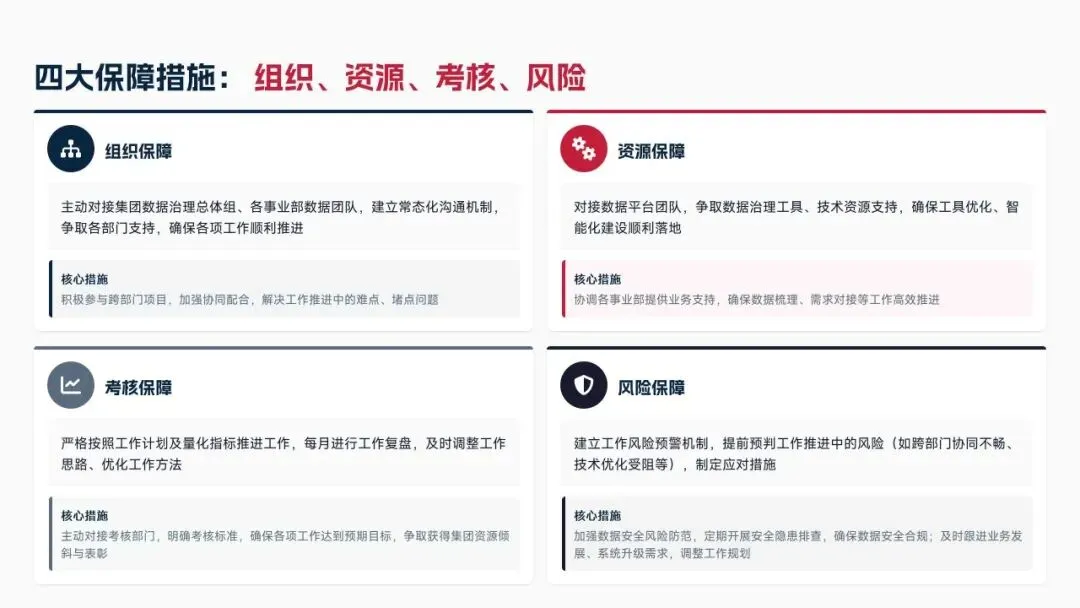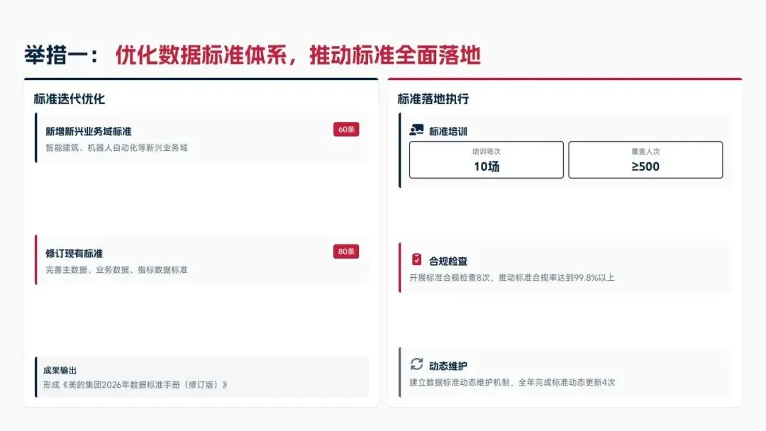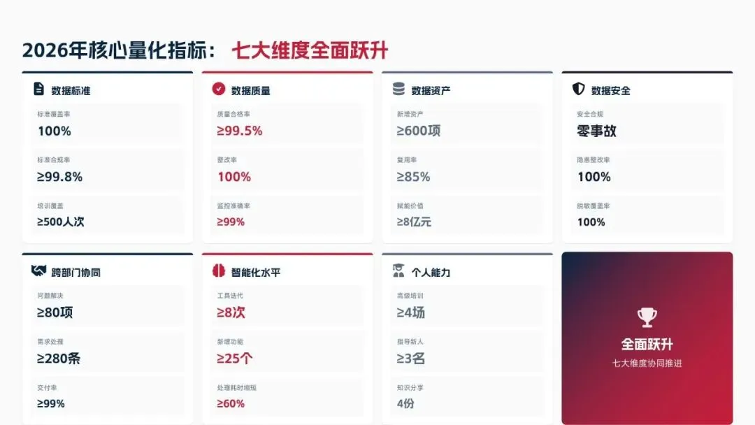 2026年制定七大核心举措,涵盖优化数据标准体系、深化质量管控与资产运营、强化安全合规与跨部门协同、提升治理智能化水平、强化个人能力与团队建设,设定数据标准覆盖率100%、资产复用率≥85%、质量合格率≥99.5%等量化目标。同时从组织、资源、考核、风险四大维度制定保障措施,补齐工作短板,深化数据治理与业务融合,为集团数字化2.0项目落地提供数据支撑,助力集团成为全球领先科技企业。
