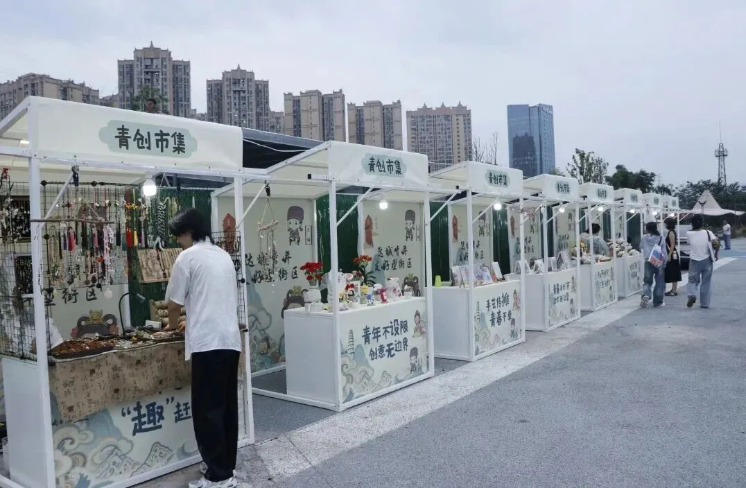 一排创意摊位整齐呈放在街区一侧。该市集主要聚焦创业青年特别是周边高校大学生的创业需求,以“季度循环+续租不超过1年”的运行机制,招募非遗手工、文创潮玩、原创设计等业态青创主理人数十名,提供摊位及摊架让青年可以周末