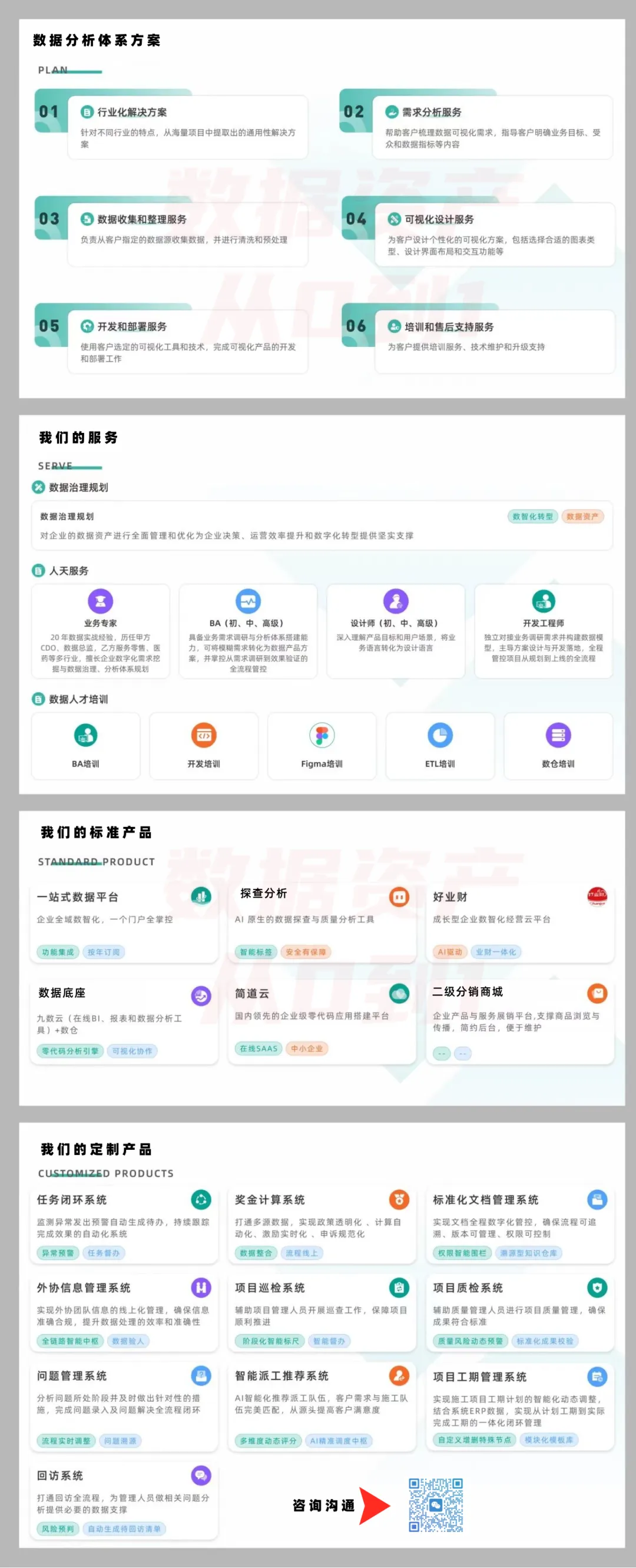 从数据沉淀到智能决策的全栈引擎,我们不是工具供应商,而是您的增长工程队,我们以“行业方案+数据治理+可视化开发+人才赋能”四维体系,为企业提供开箱即用的数据平台、深度定制的智能工具及全周期专家支持,快速破解数据分散、决策滞后、人才短缺转型难题