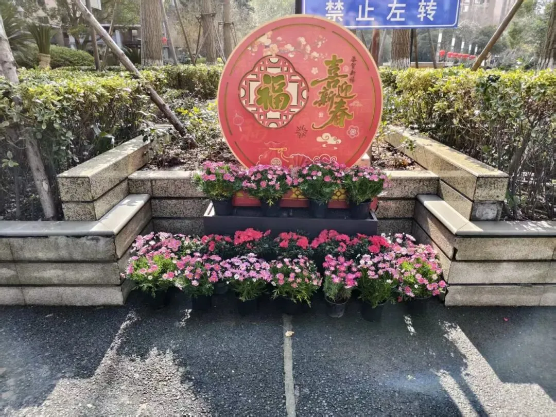墙面上,寓意美好的春花贴纸也安排上了。就这么一布置,整个小区瞬间变得红红火火,到处都飘着欢乐祥和的过年味儿。