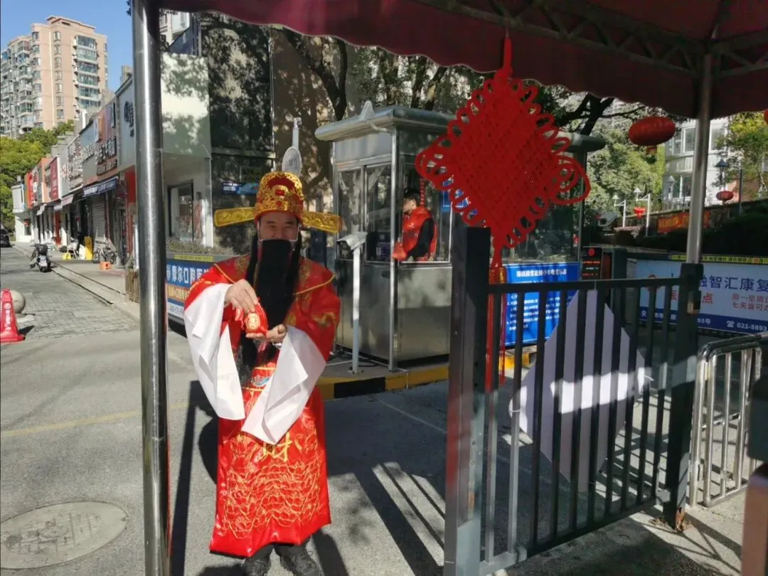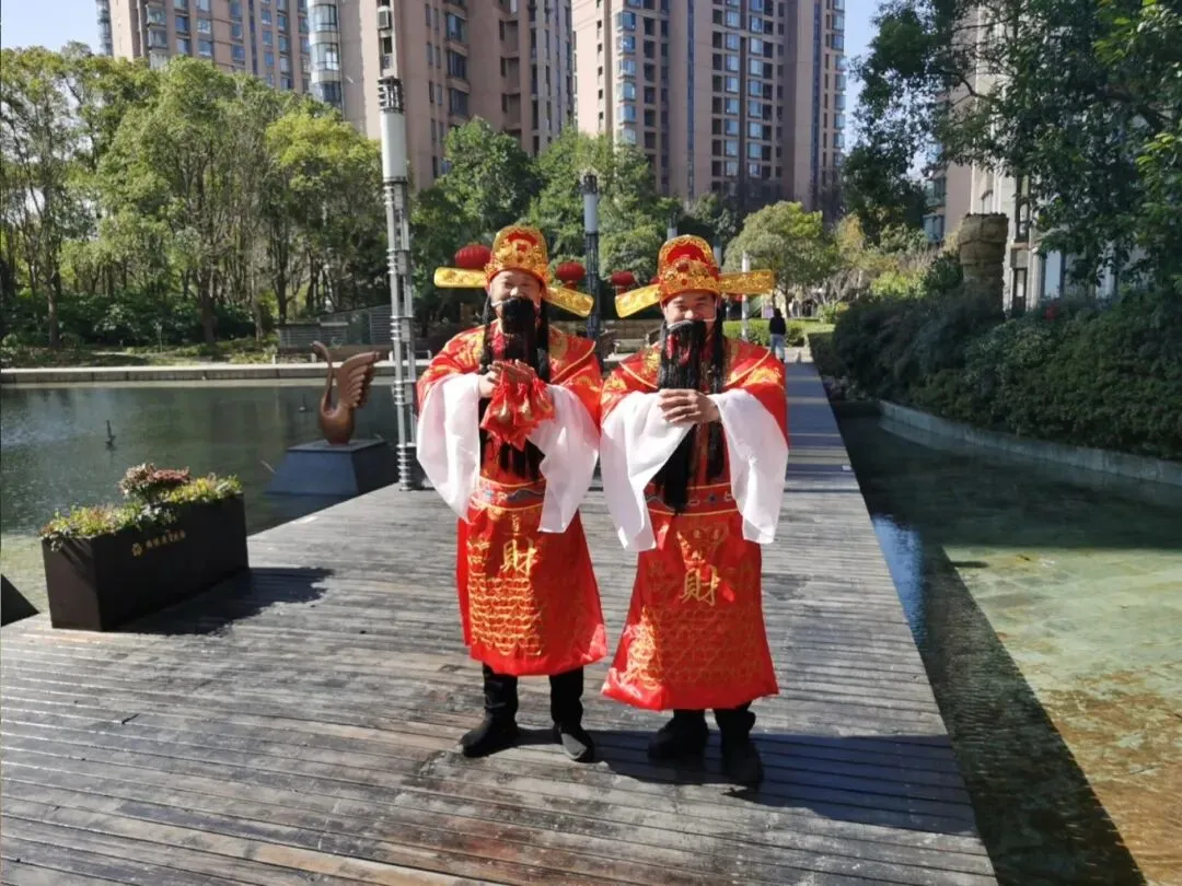 大门口派送福袋,业主接福拱手道谢,直呼财神到、福气绕。