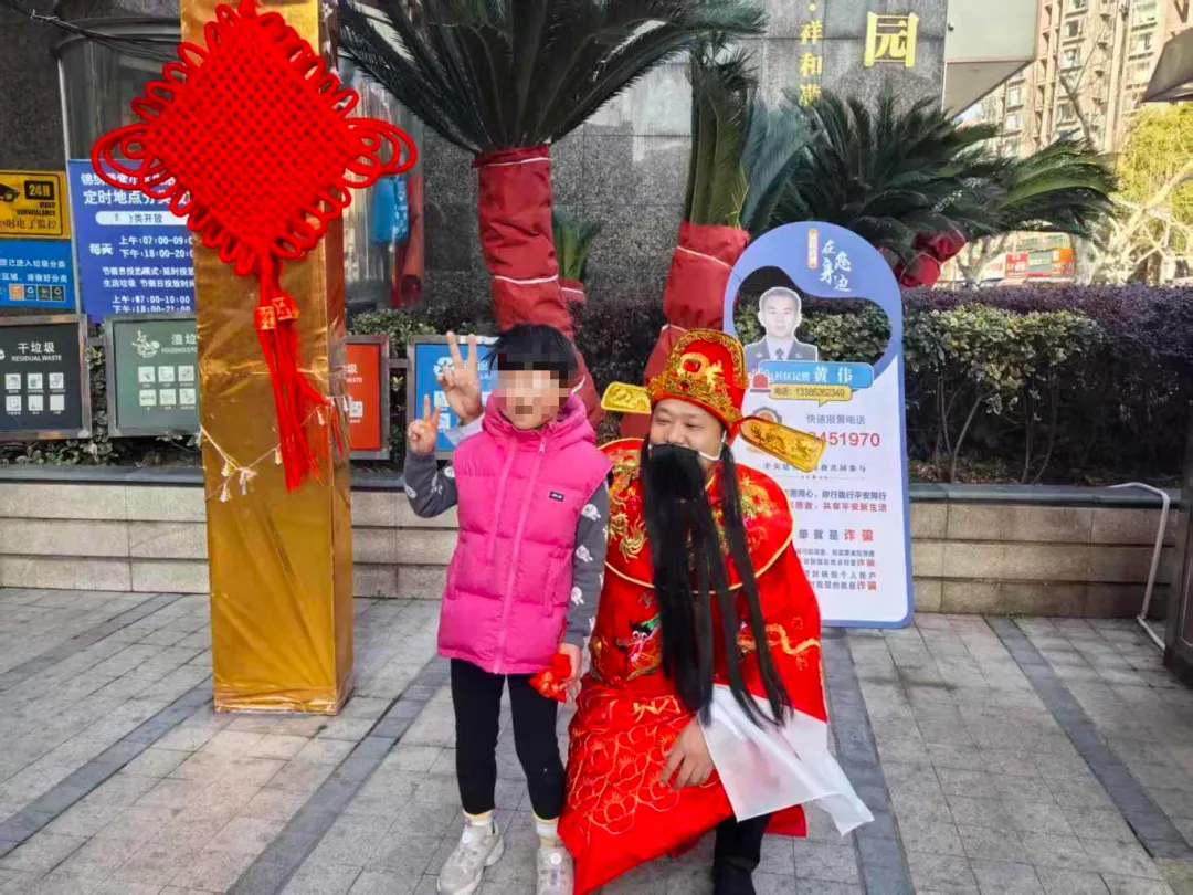 正月初五,财神爷手持金元宝现身小区,孩童踮脚争摸“福运元宝”,老人笑称摸到好兆头、手气旺。