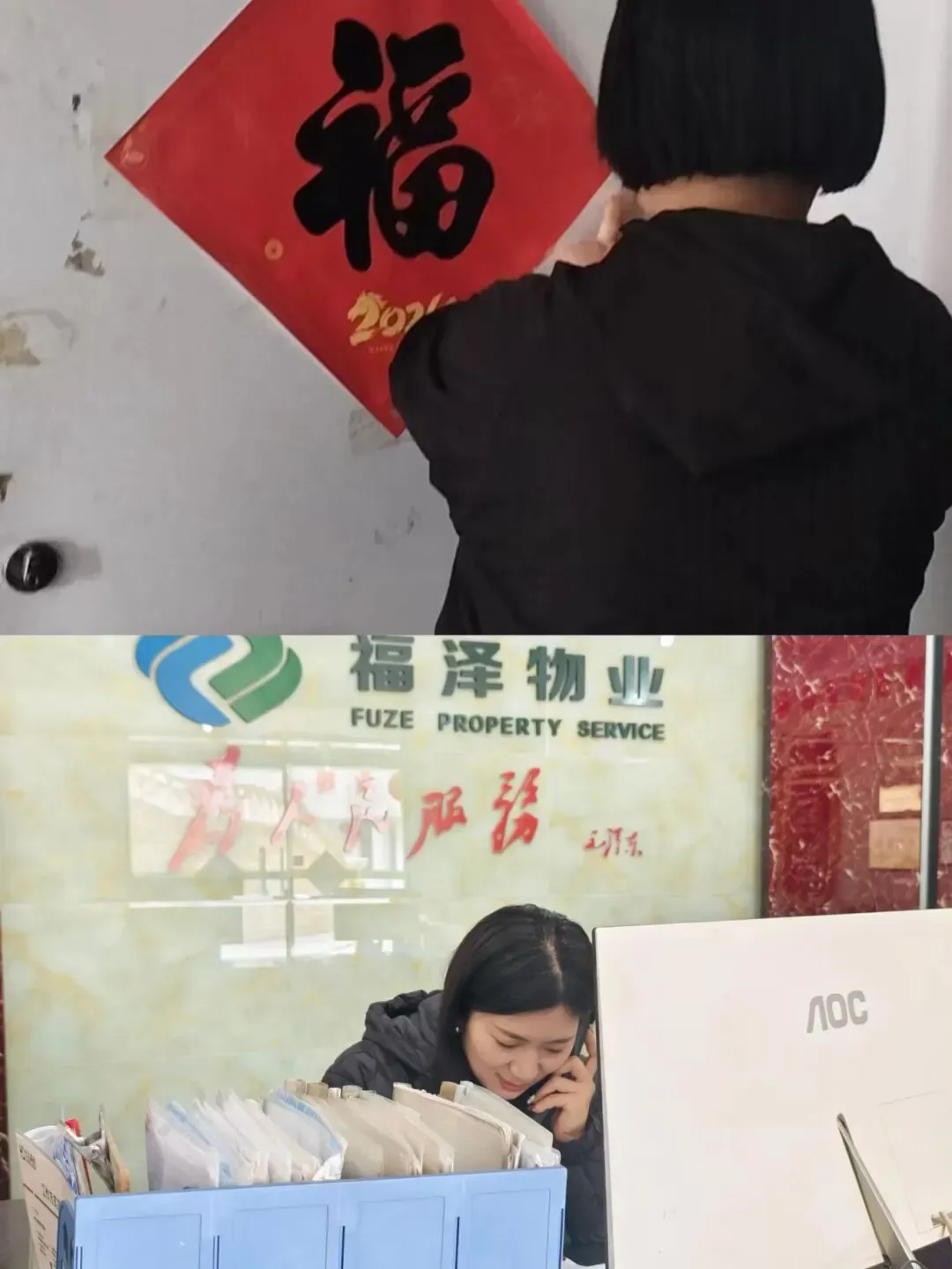 节前保洁阿姨们每家每户送去新春对联,祝福大家新年新气象。