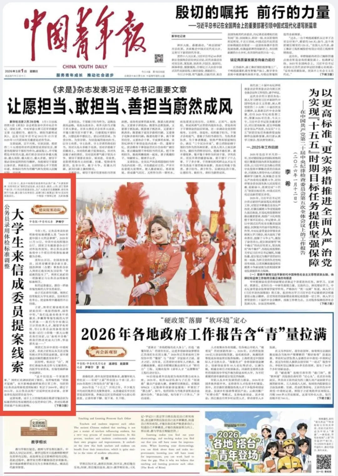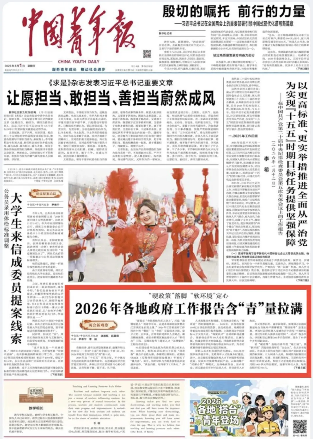聚焦青春经济、青年友好型政策体系、最懂年轻人的社区……让青年落下脚、留下来、扎下根,中青报文章《2026年各地政府工作报告含“青”量拉满》聚焦全国各地政府工作报告中青年相关政策。