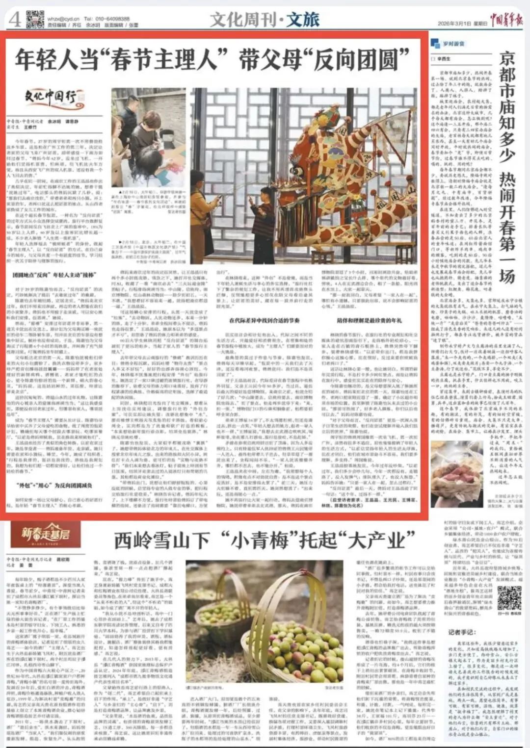 奔赴儿女所在地过年,从小众选择变成潮流,中青报文章《年轻人当“春节主理人”带父母“反向团圆”》关注春节团圆新方式。