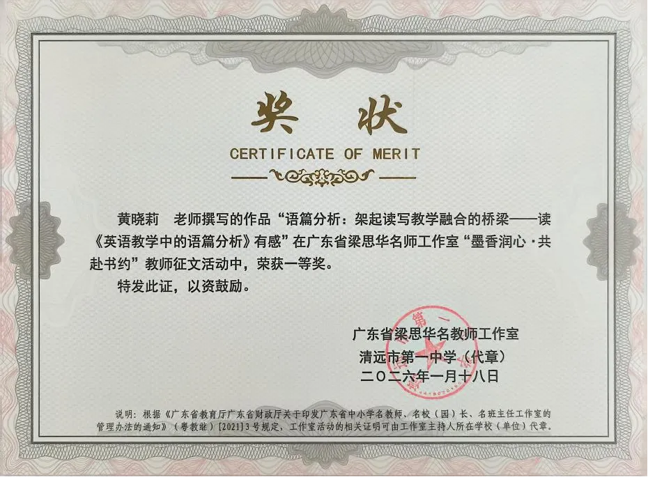 2025年,我始终以谦逊求知的态度积极参与工作室各项研修活动,认真撰写研修心得,在实践中锤炼本领,在积累中突破自我。在工作室“墨香润心·共赴书约”教师征文活动中,我撰写的《语篇分析:架起读写教学融合的桥梁——读<英语教学中的语篇分析>有感》荣获一等奖,用文字沉淀研修感悟,用思考赋能教学实践。