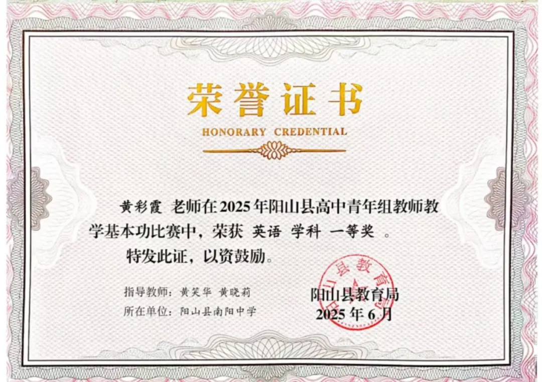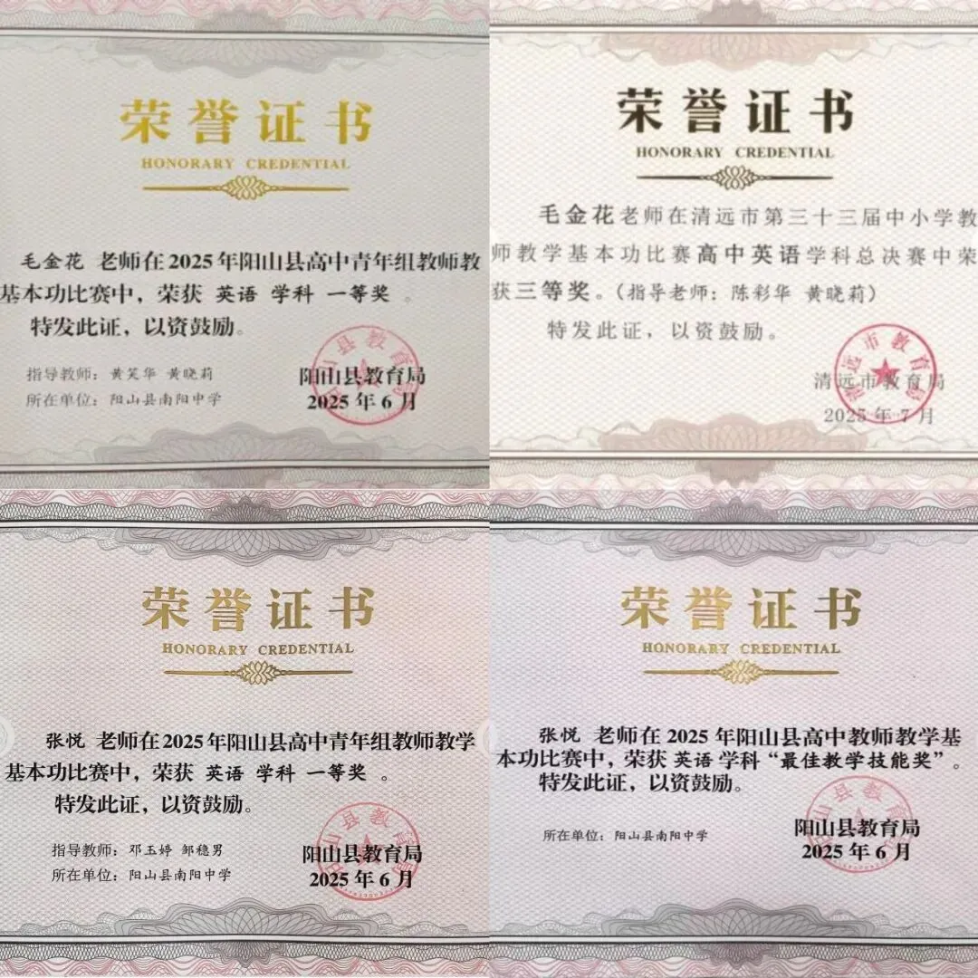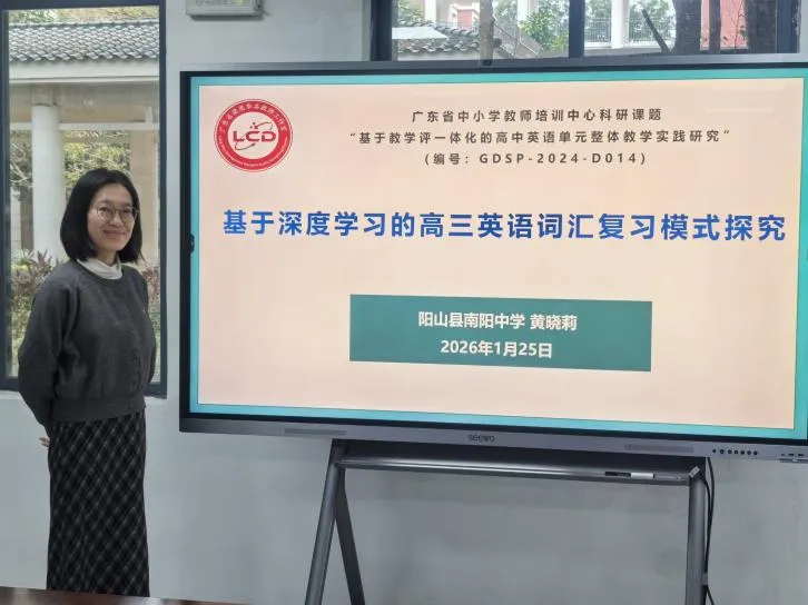 科研与教学并行,成长与提升共进。本年度,我有幸参与广东省中小学教师培训中心专项科研课题“基于教学评一体化的高中英语单元整体教学实践研究”,在课题研究中拓宽视野、深化认知。同时,我注重总结教学经验、提炼教学心得,撰写的论文《基于逆向设计的高中英语语法教学评一体化探究》,在2025年阳山县优秀教学论文评选中荣获三等奖,实现了教学实践与理论研究的双向赋能。此外,我还开展了《基于深度学习的高三英语词汇复习模式探究》专题讲座,从传统高三词汇复习误区切入,结合人教版必修三相关单元案例,分享了基于单元大观念的词汇复习模式与实操方法,为高三英语词汇复习提质增效提供思路,也进一步提升了自身教学研究与分享能力。