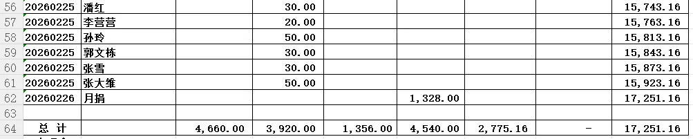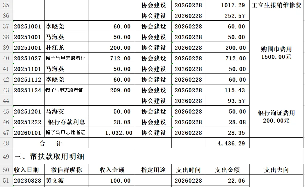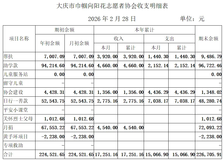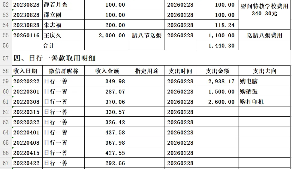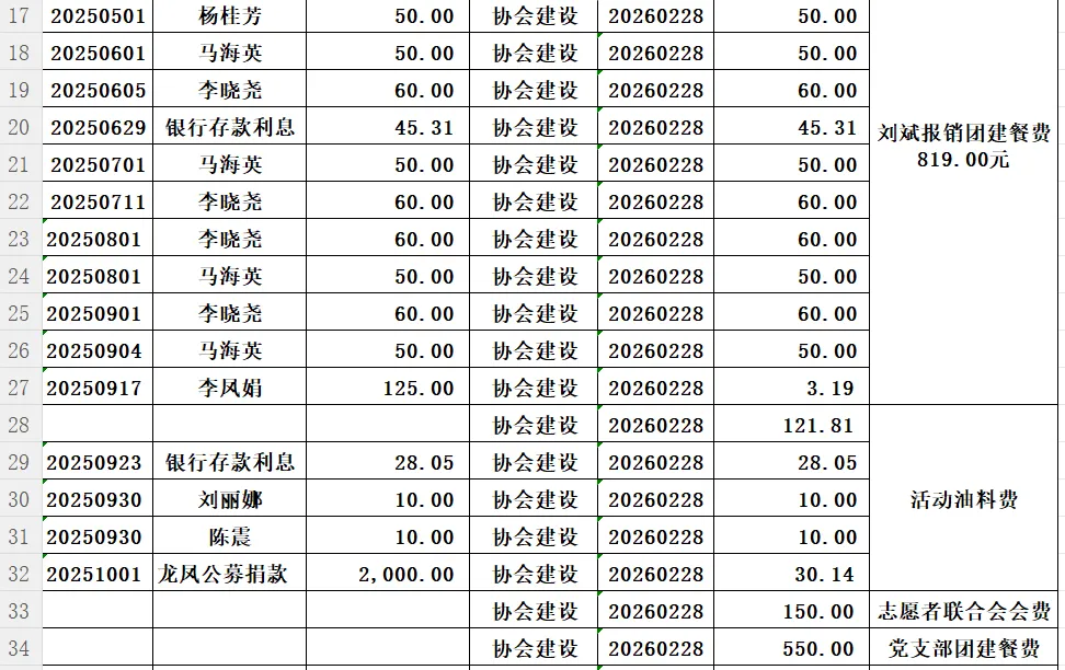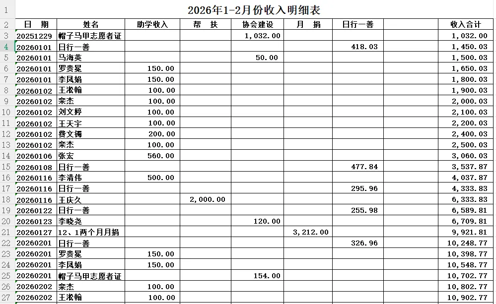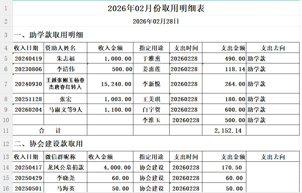 2、按时完成了捐赠及其他款项的收取存入工作,及时完成了助学款、助老款、协会建设款、及所承接项目款的各项支出工作;