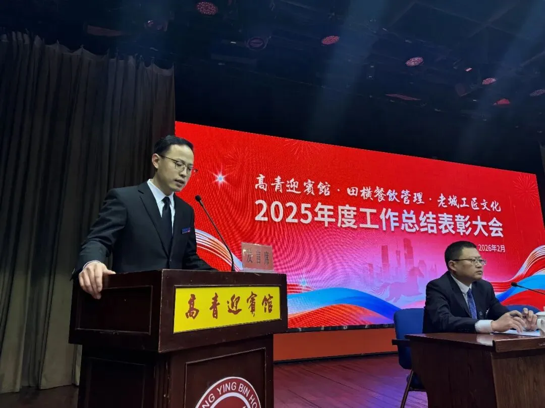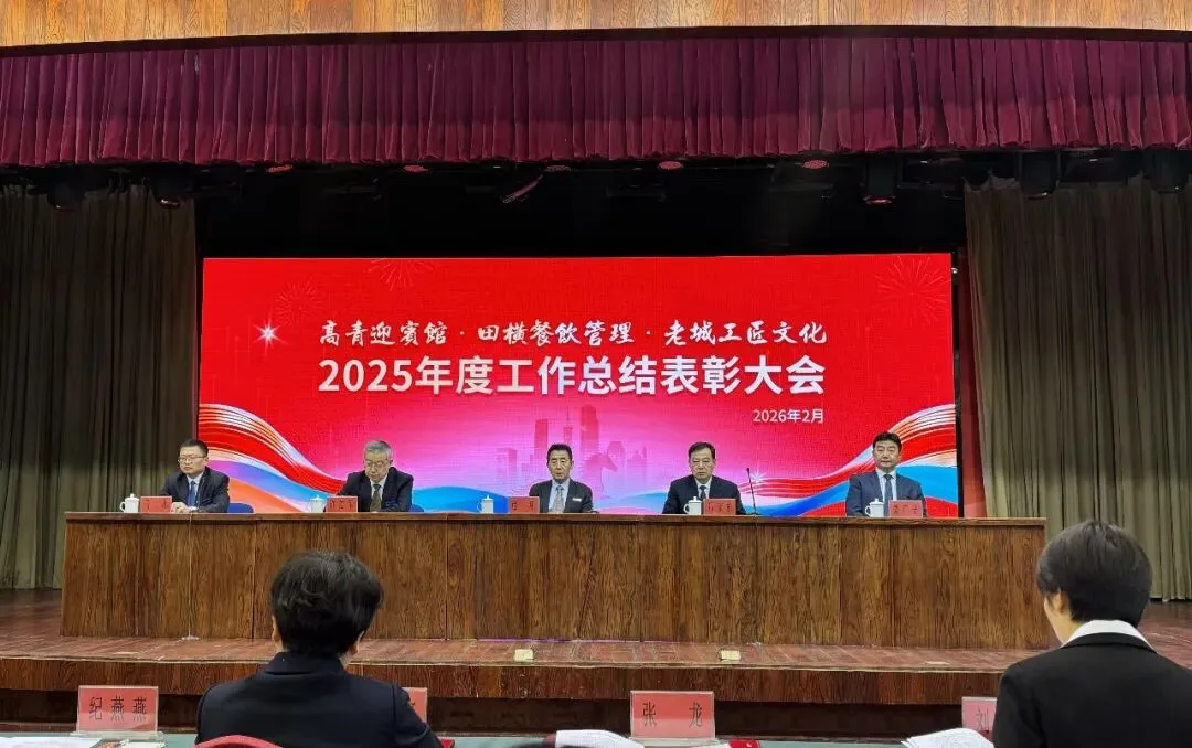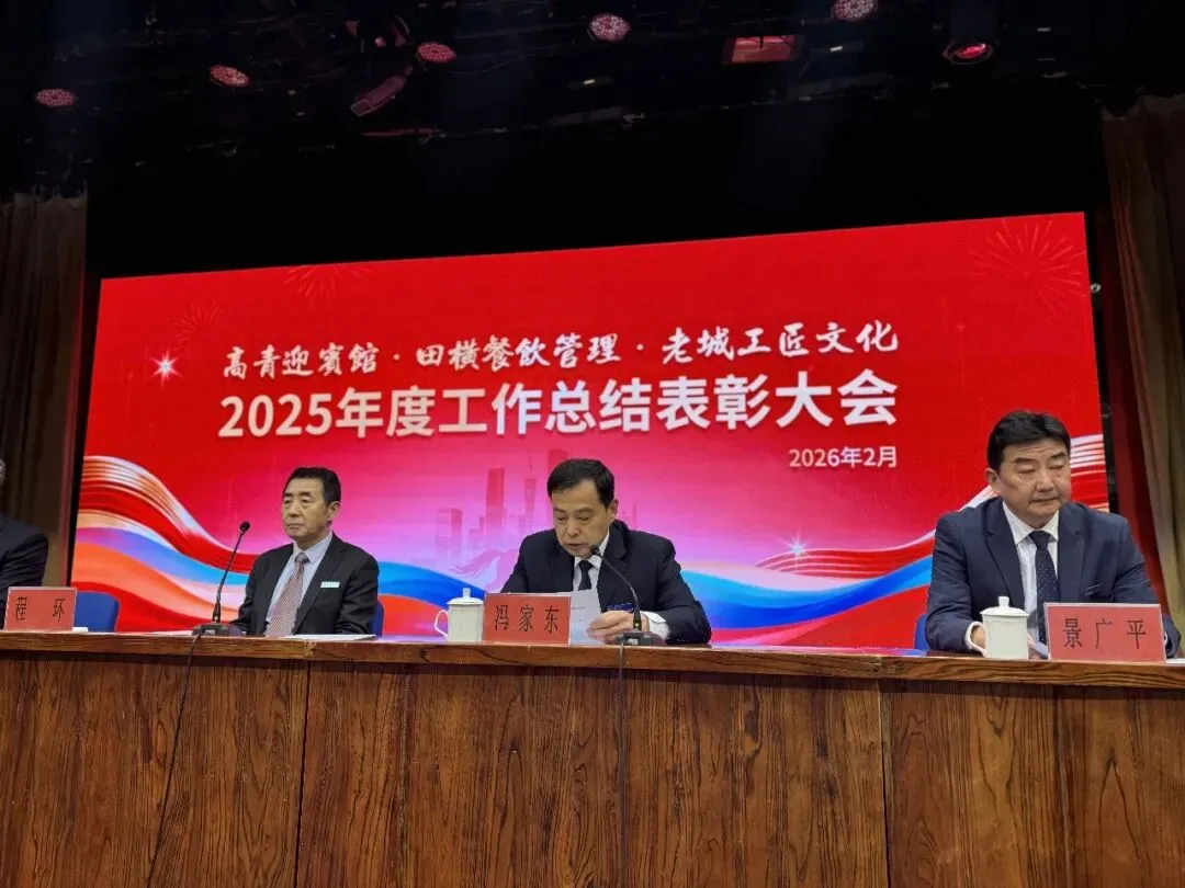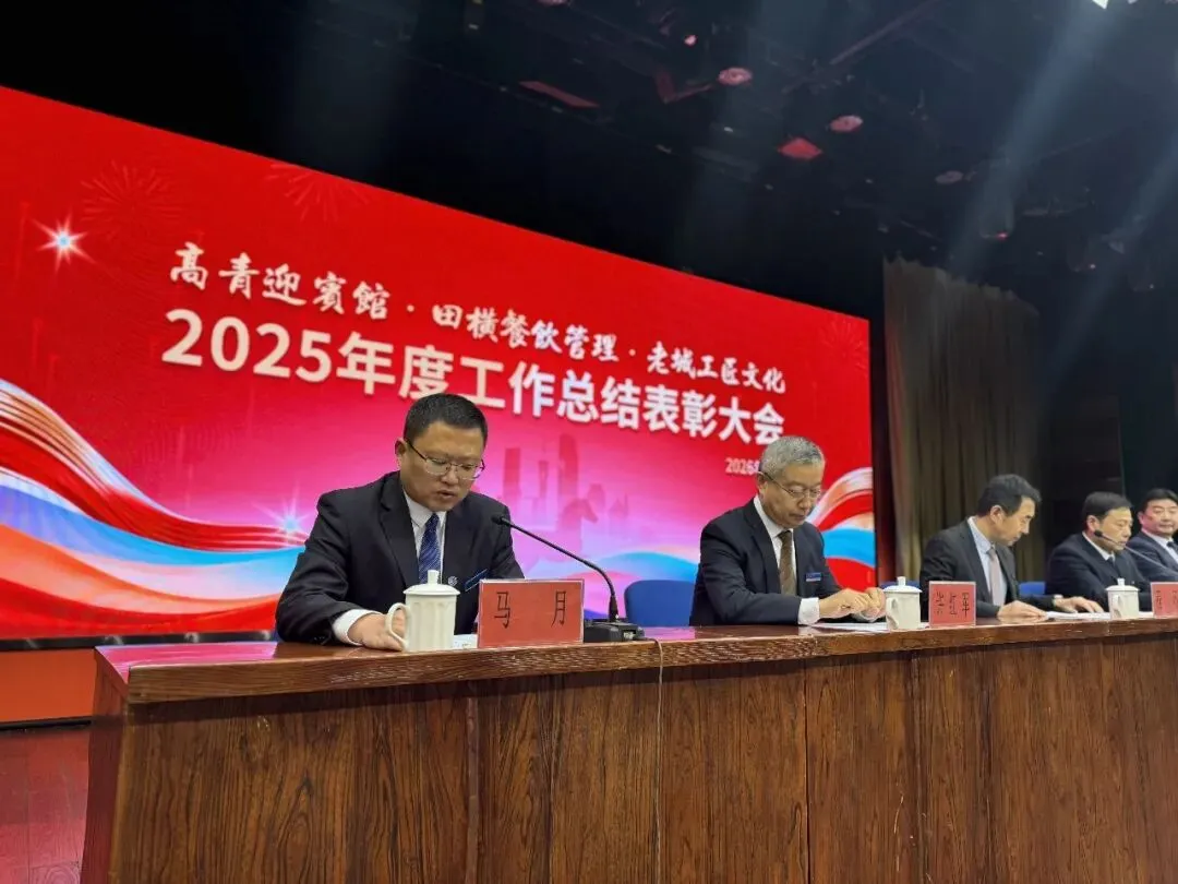 2月28日,高青迎宾馆、田横餐饮管理、老城工匠文化在牡丹厅召开2025年度工作总结表彰大会,全体员工齐聚一堂,复盘年度耕耘、表彰先进集体、部署2026年发展目标,共绘品牌发展新蓝图。