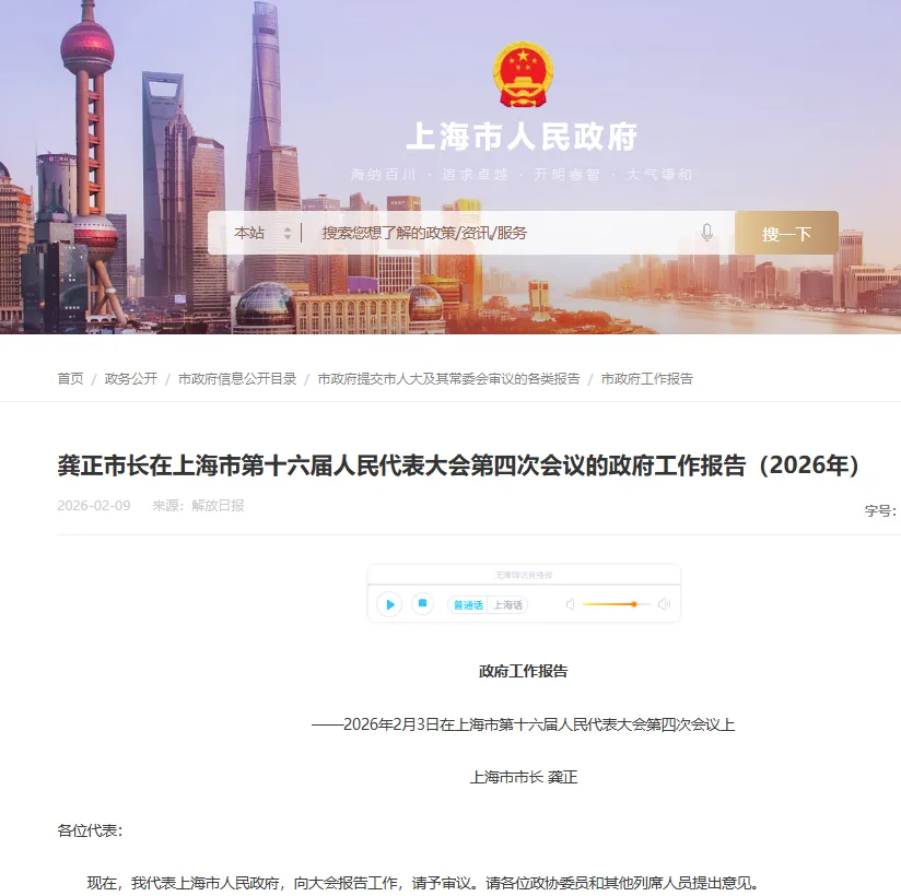 2026年2月3日,上海市市长龚正在上海市第十六届人民代表大会第四次会议上作政府工作报告。报告提出,2026年将深化国际经济中心建设。聚焦建设现代化产业体系,持续巩固壮大实体经济根基,积极支持智能网联新能源汽车、海洋经济、低空经济、航空航天、卫星互联网等产业发展,培育特色数字产业集群,大力推动服务业扩能提质、集聚发展。现将《上海市人民政府工作报告》全文分享如下。