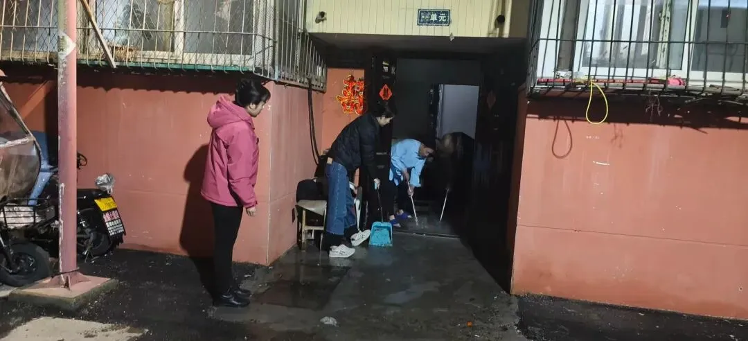 铁西街道组宣统委员李莹带队现场处置伯马东院暖气管爆裂问题。