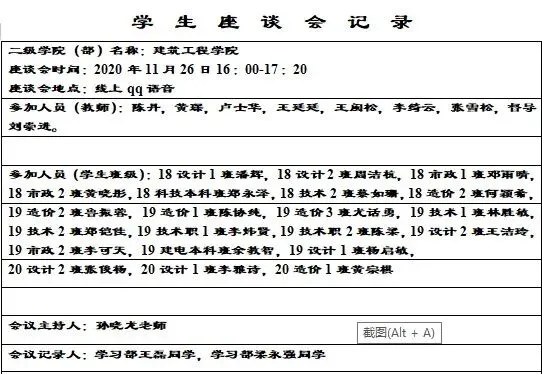 为更好地提升学生教学管理工作,学院于11月24日举行2020-2021学年第一学期线上期中座谈会。学生代表们就教学方面的问题积极发言,各抒己见。学院领导认真听取学生提出的意见,并给予反馈和解决。期中座谈会促进了师生间的良好沟通,,切实地提高了教学质量。