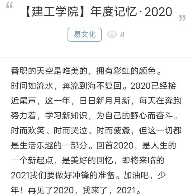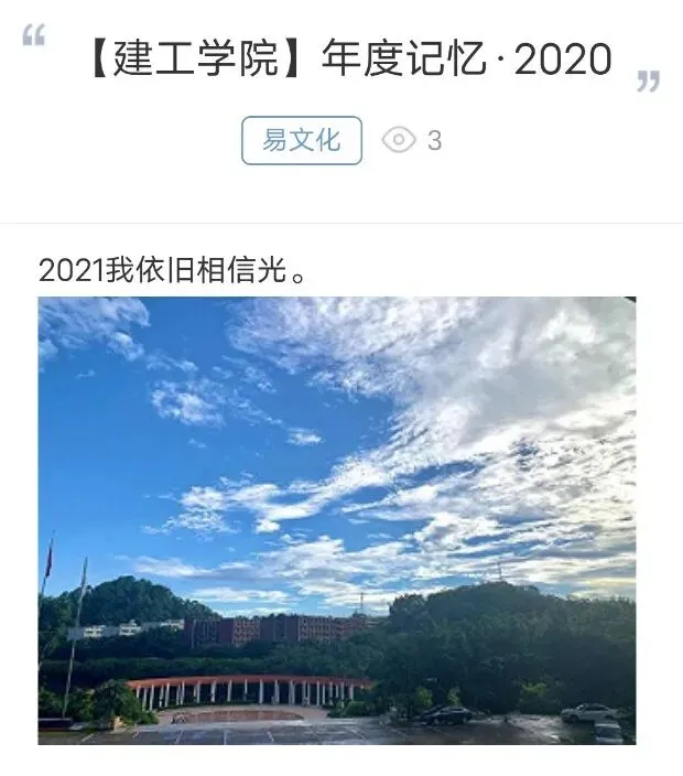 为回顾2020年历程,唤起学生对生活的感触,在元旦到来之际,建工分站推出“年度记忆2020”活动,我院学子积极参与,回首对2020年学习生活的感悟,体现了我院学生立足当下,展望未来的精神面貌。